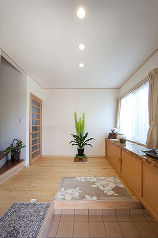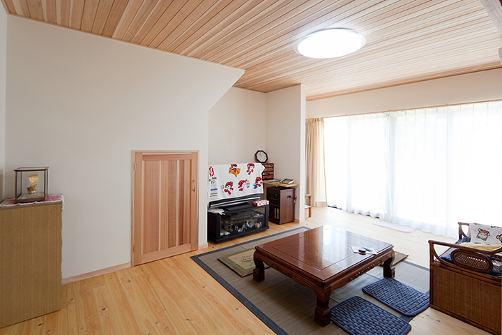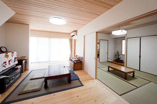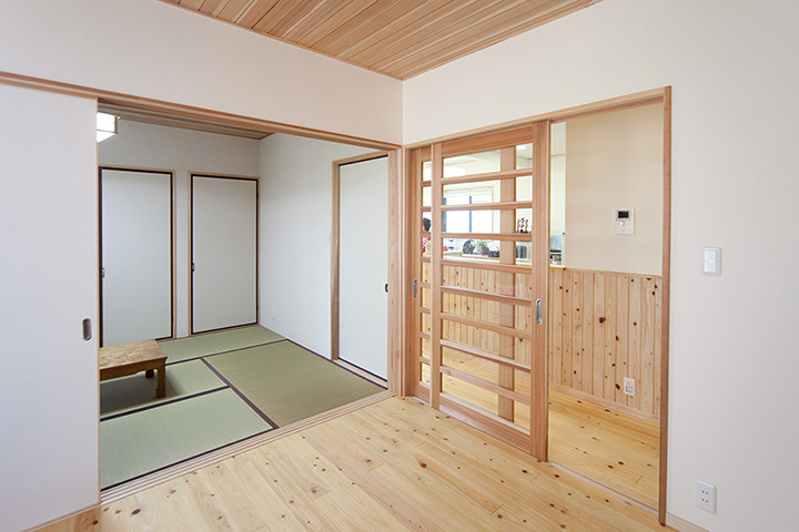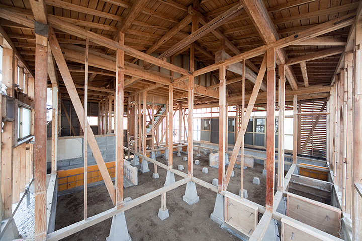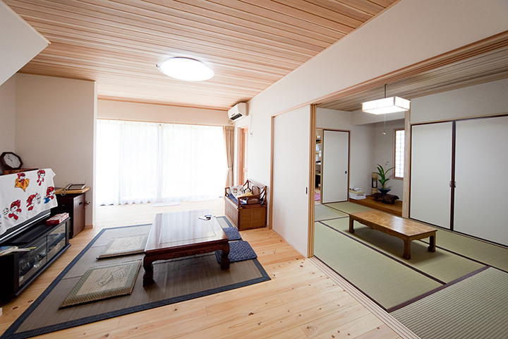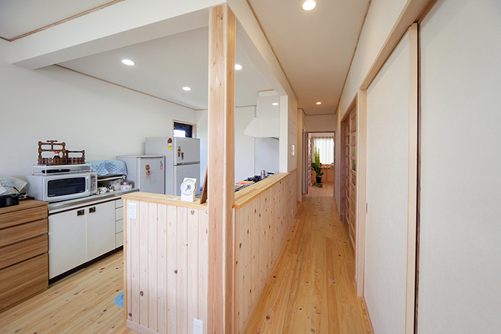 「耐震性能を向上させたい」というご希望から、耐震診断の結果をもとに、壁をすべて取り払いスケルトン状態にし、基礎部分と構造部分の耐震補強を行いました。筋交を増やし、金物補強などを行うことで、現行の耐震基準をクリアし、この先も安心して暮らしていただける住まいになりました。 「おもてなし空間」であった日当たりの良い二間続きの和室は、1室を畳から桧の無垢材に改修し、南からの光をまんべんなく取り入れられるリビングへと生まれ変わり、独立型キッチンは壁と建具を取り払い、隣り合う和室と一続きにし、会話の弾むダイニングキッチンとなりました。