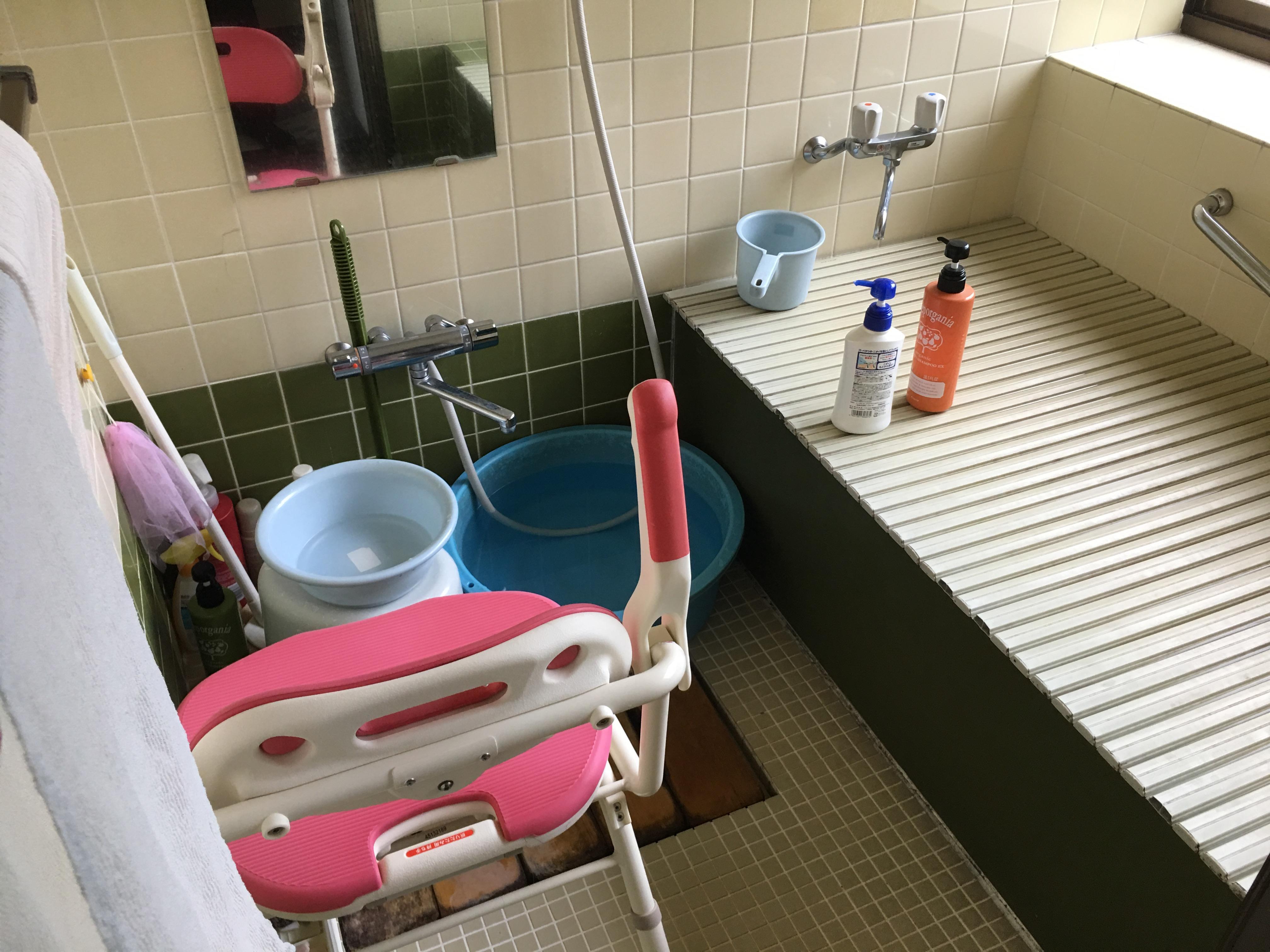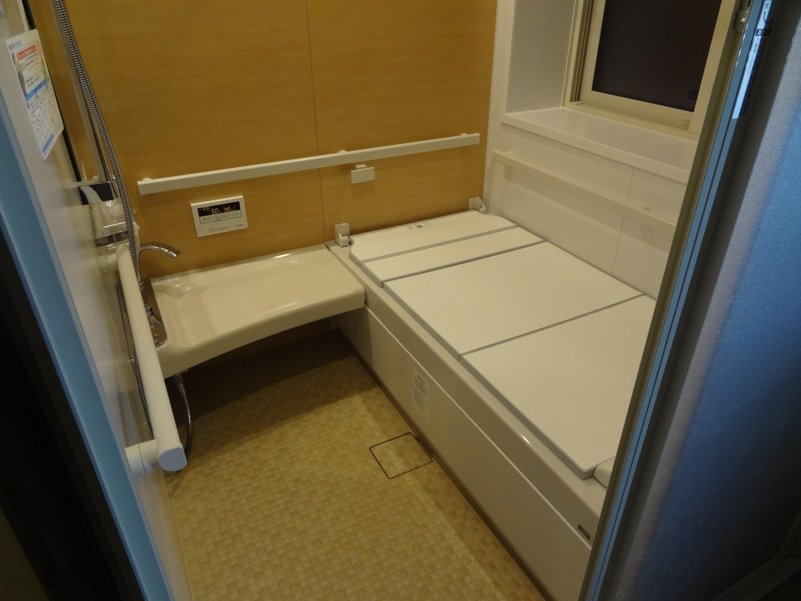 改修前は浴室に椅子を置いていたが、改修後は、4面手すり付きで、備え付け椅子があるので座ってシャワーができるようになっている。 段差をなくてし快適に過ごせるように工夫した。