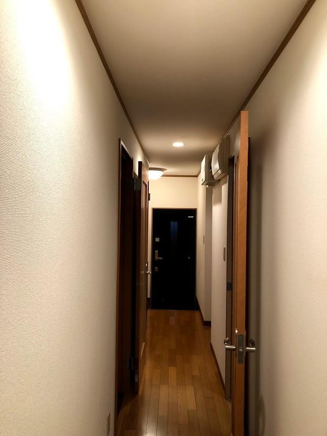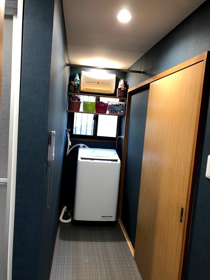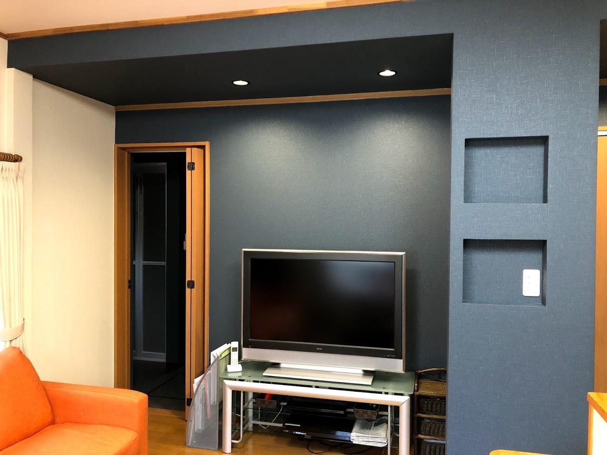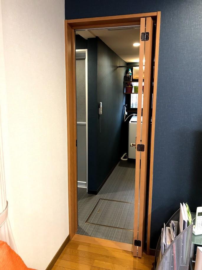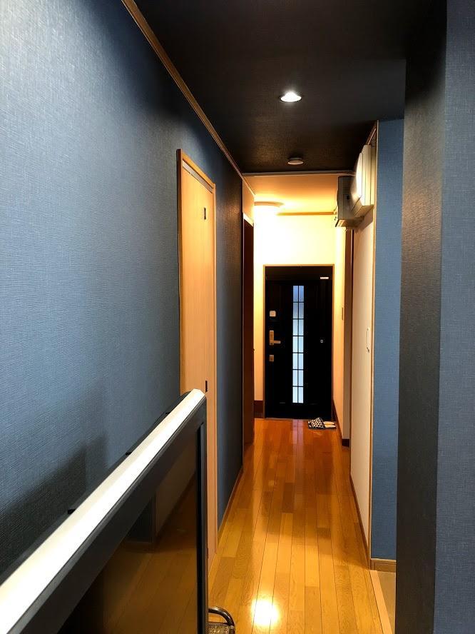 玄関から奥まで長い一直線な廊下。 この廊下を境に部屋が分断されておりました。 それぞれの部屋の扉が外開きとなっており、ぶつかることもしばしば! いっそ廊下をリビング内に取り込んで広くしてしまおう!と考えられました。 壁紙も青くコーディネートして、とてもオシャレな空間へと変わりました。
