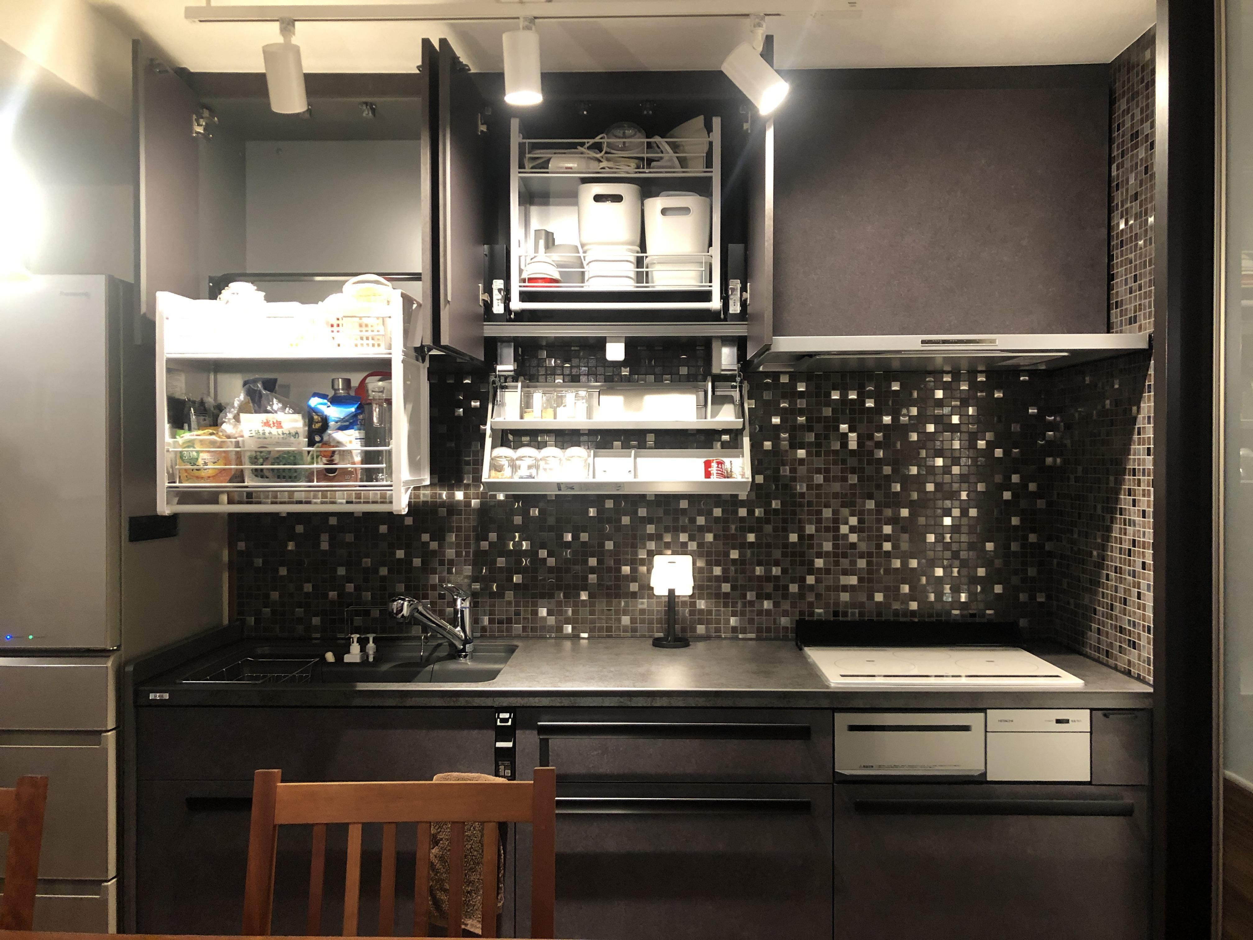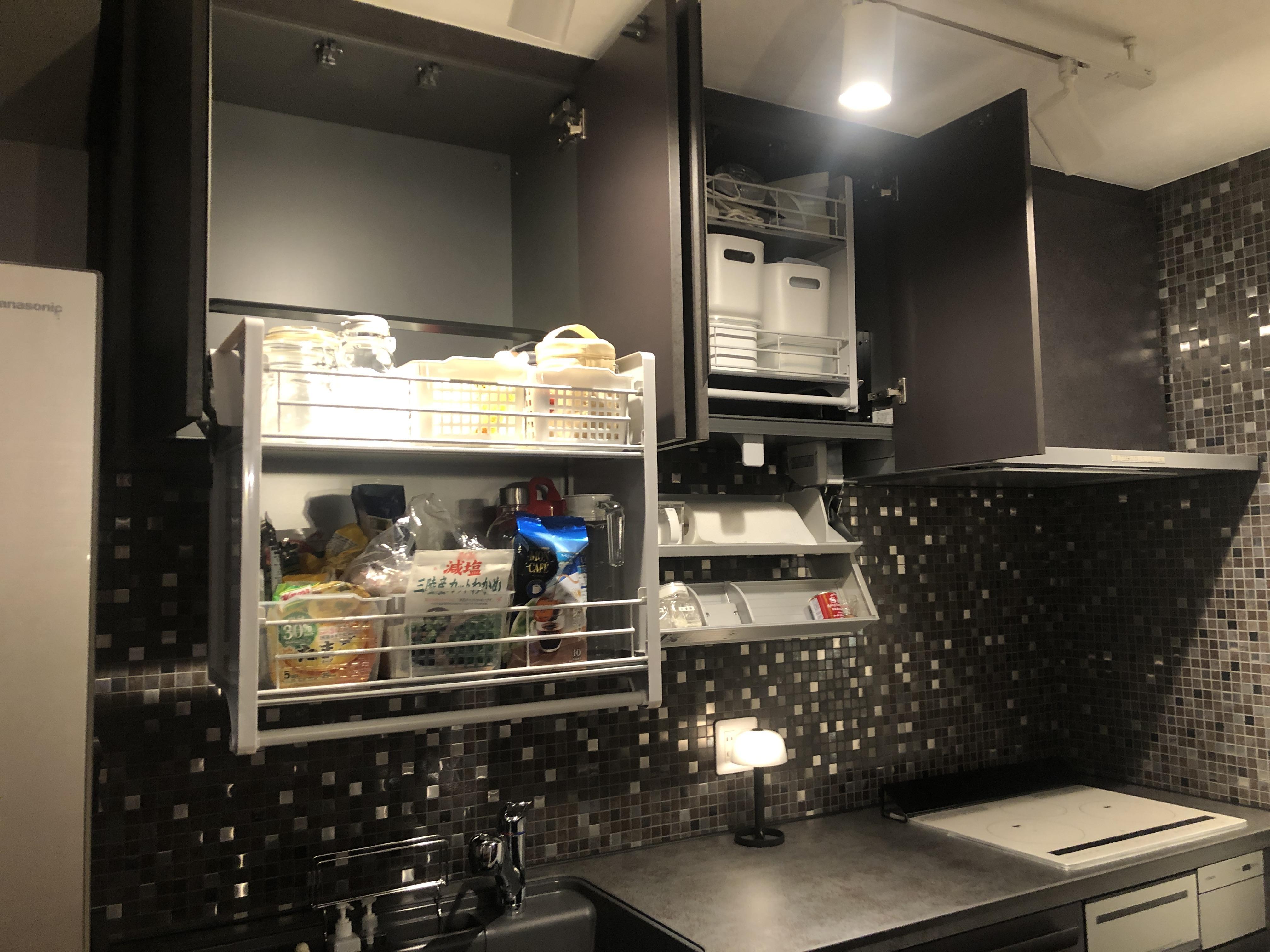 手が届かず使い勝手の悪かった上部収納は手が届く位置まで降りてくるタイプへ。