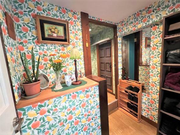 お花に囲まれたヨーロッパのような雰囲気。飾っている絵もよく映えて、落ち着きつつも華やかな空間が広がります。オープンタイプの靴箱も、柄物のクロスをもってくることによって、目が行かず気にならなくなります。