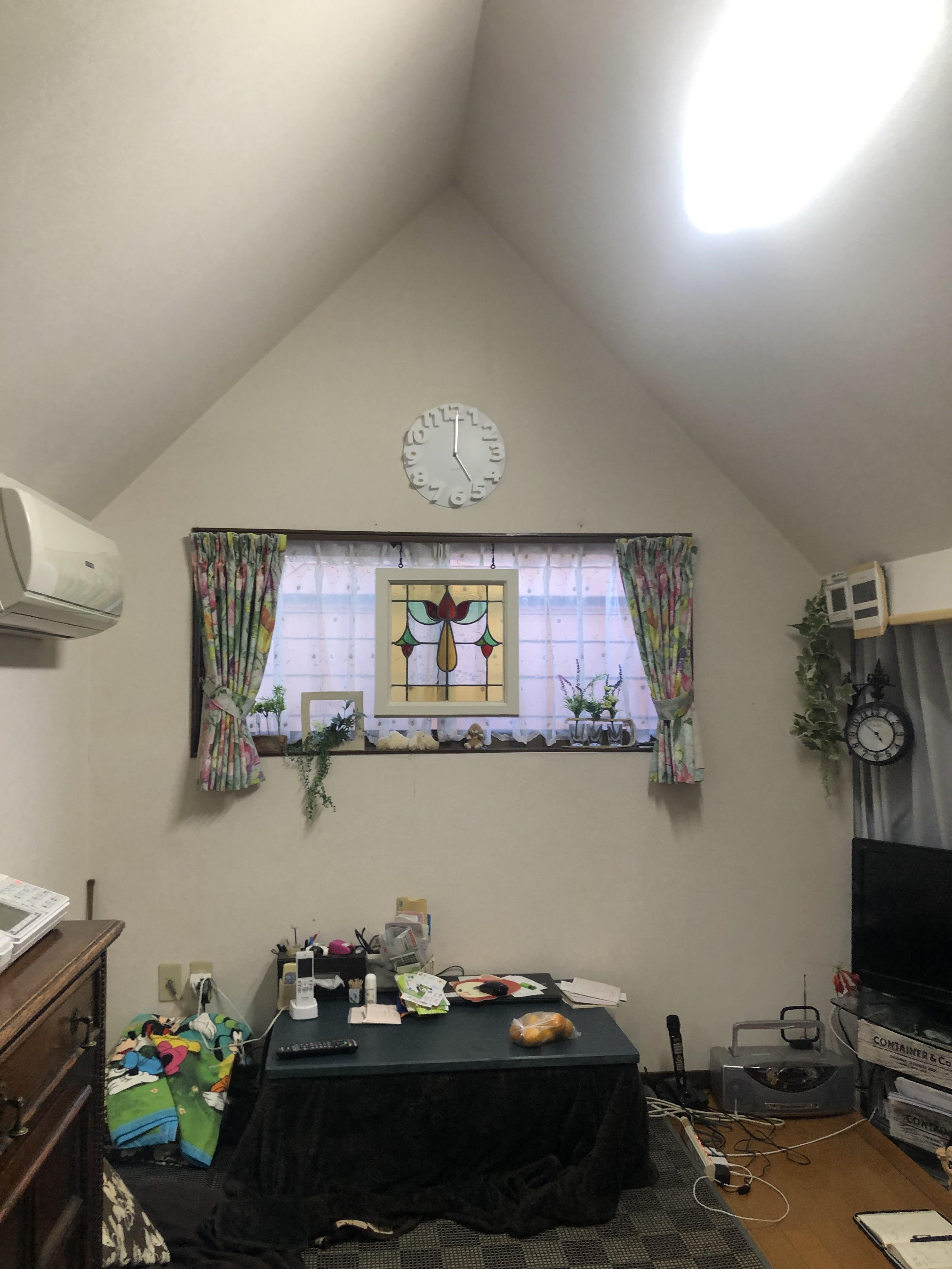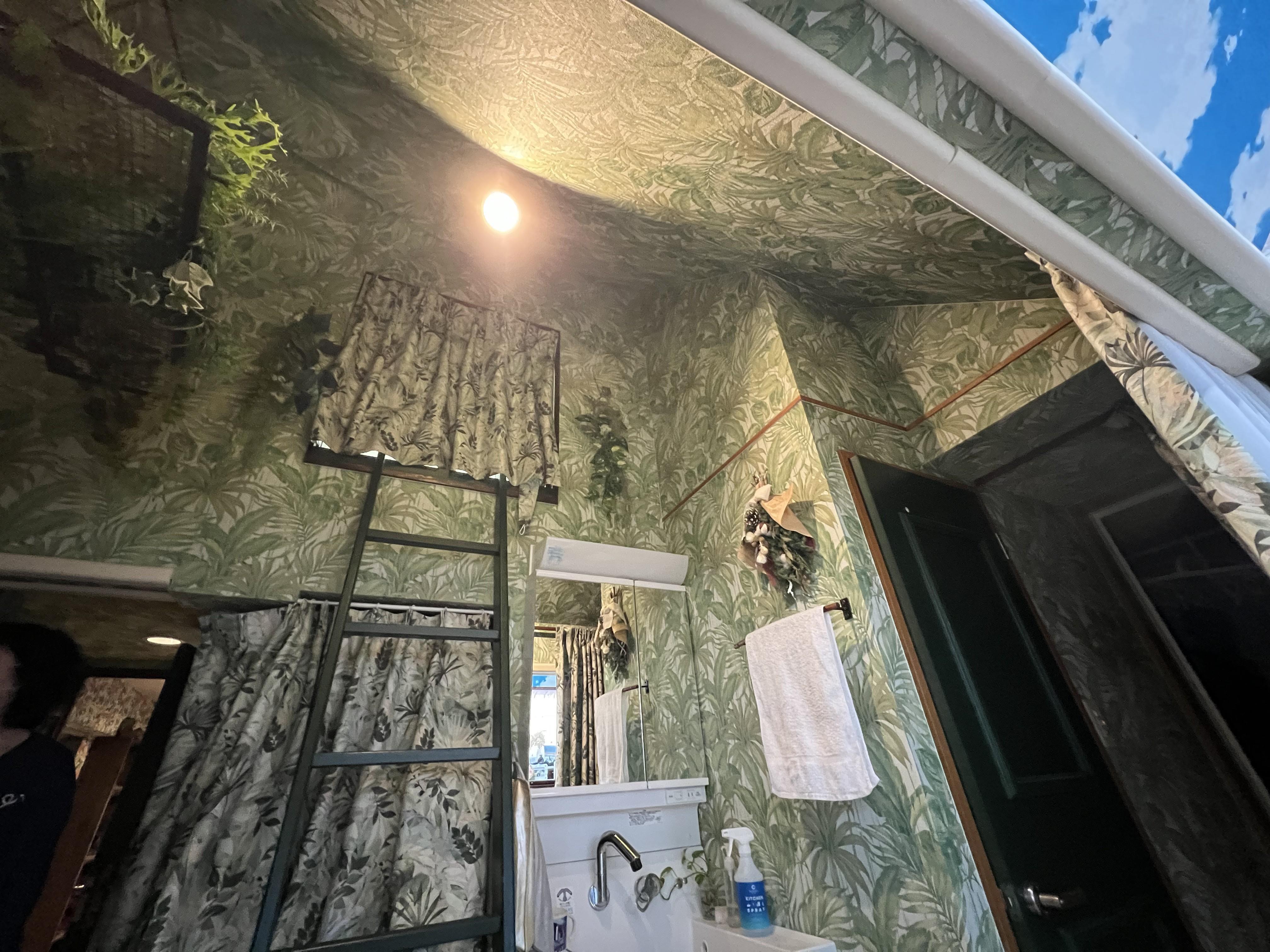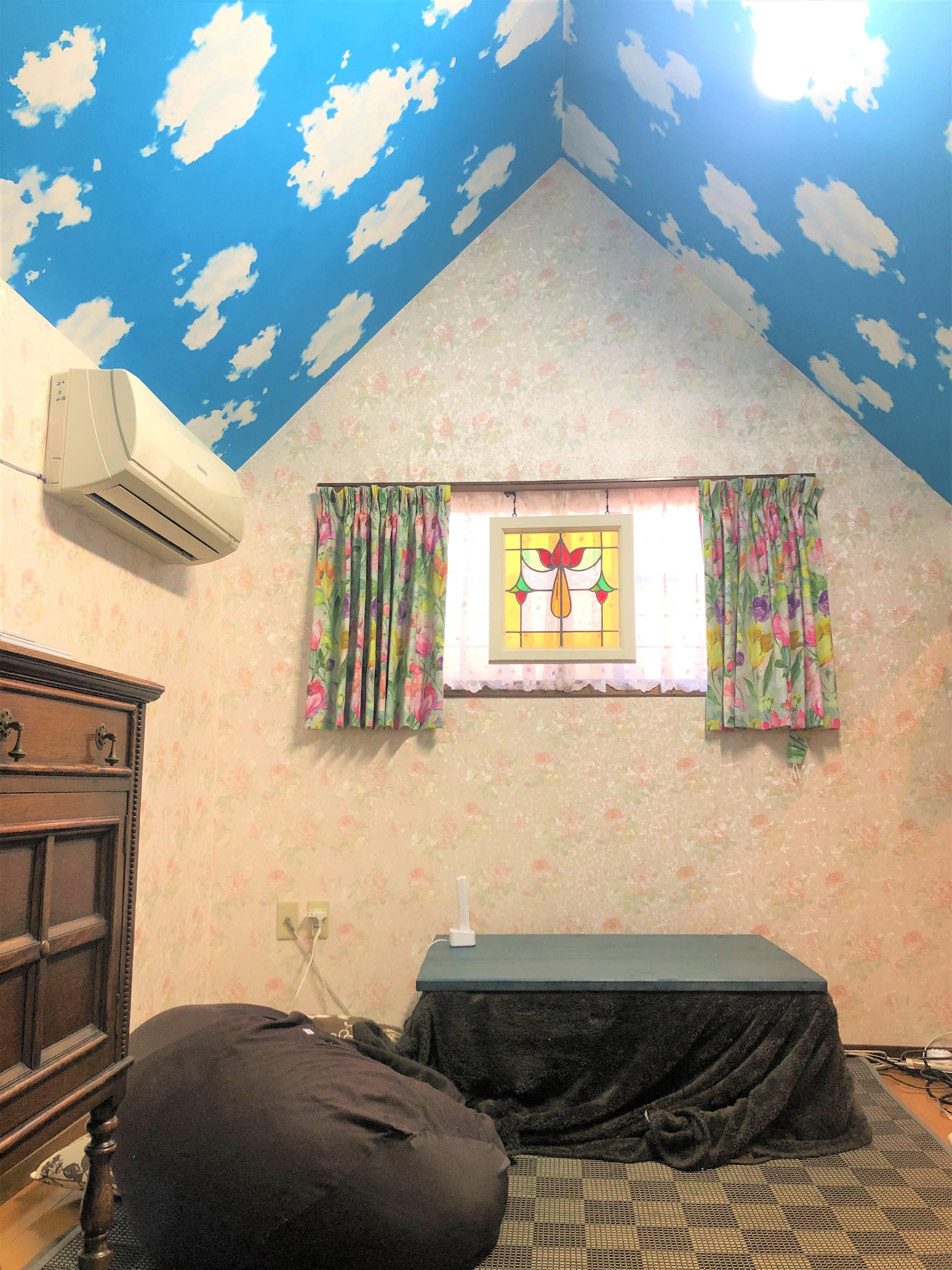 三角天井が可愛いくつろぎスペース。壁はカーテンに合わせた花柄です。実際はそんなに色味は強くないのですが、光に当たるとキラキラとお花の模様がきらめいて見えます。そして、天井は寝ころんだときに少しでも外にいるような気持ちになりたいと空模様をチョイス。