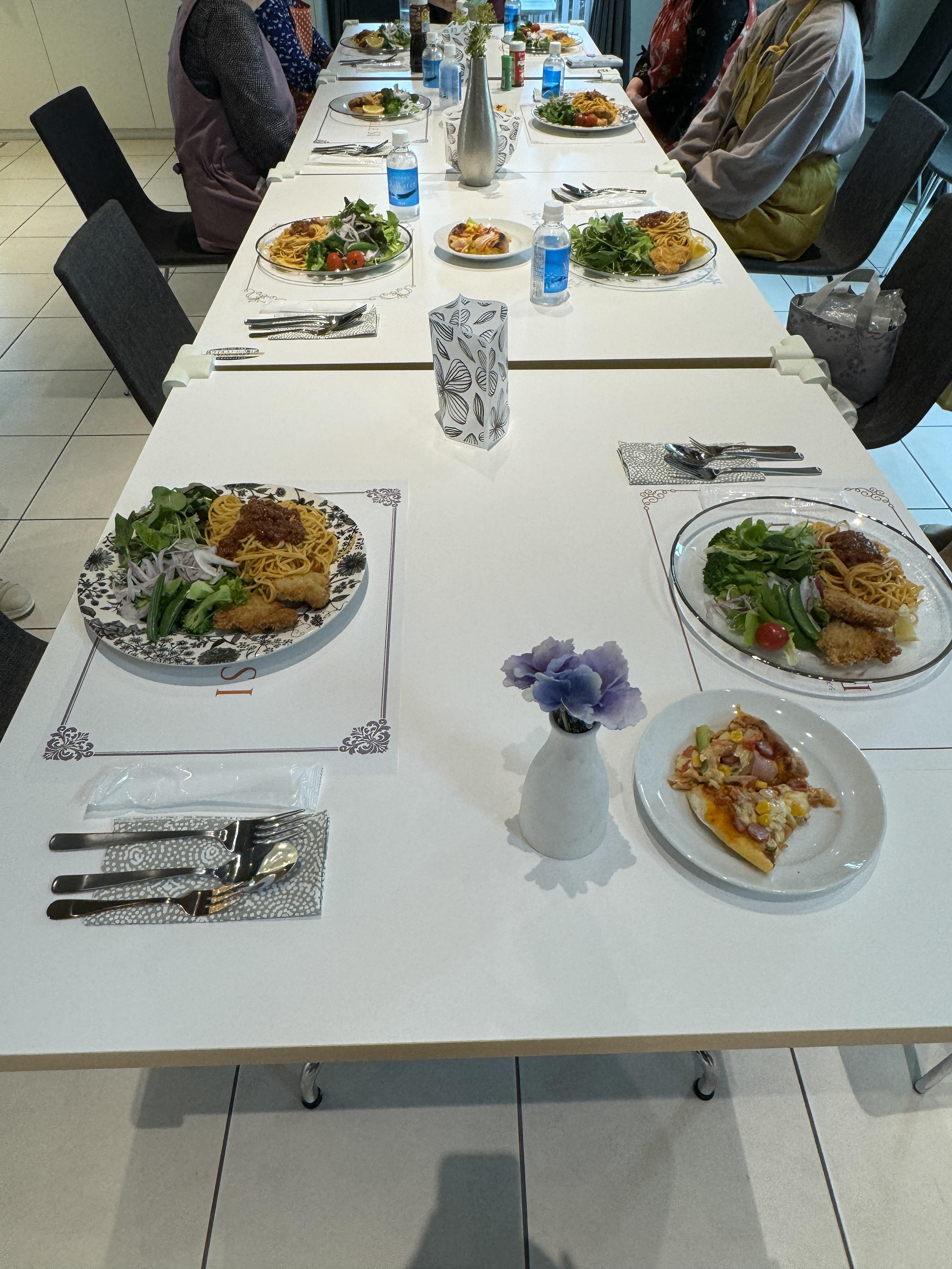 完成後はバイキング形式でサラダやヒレカツ・パスタを取り、最後はコーヒーとデザートを食べました♪