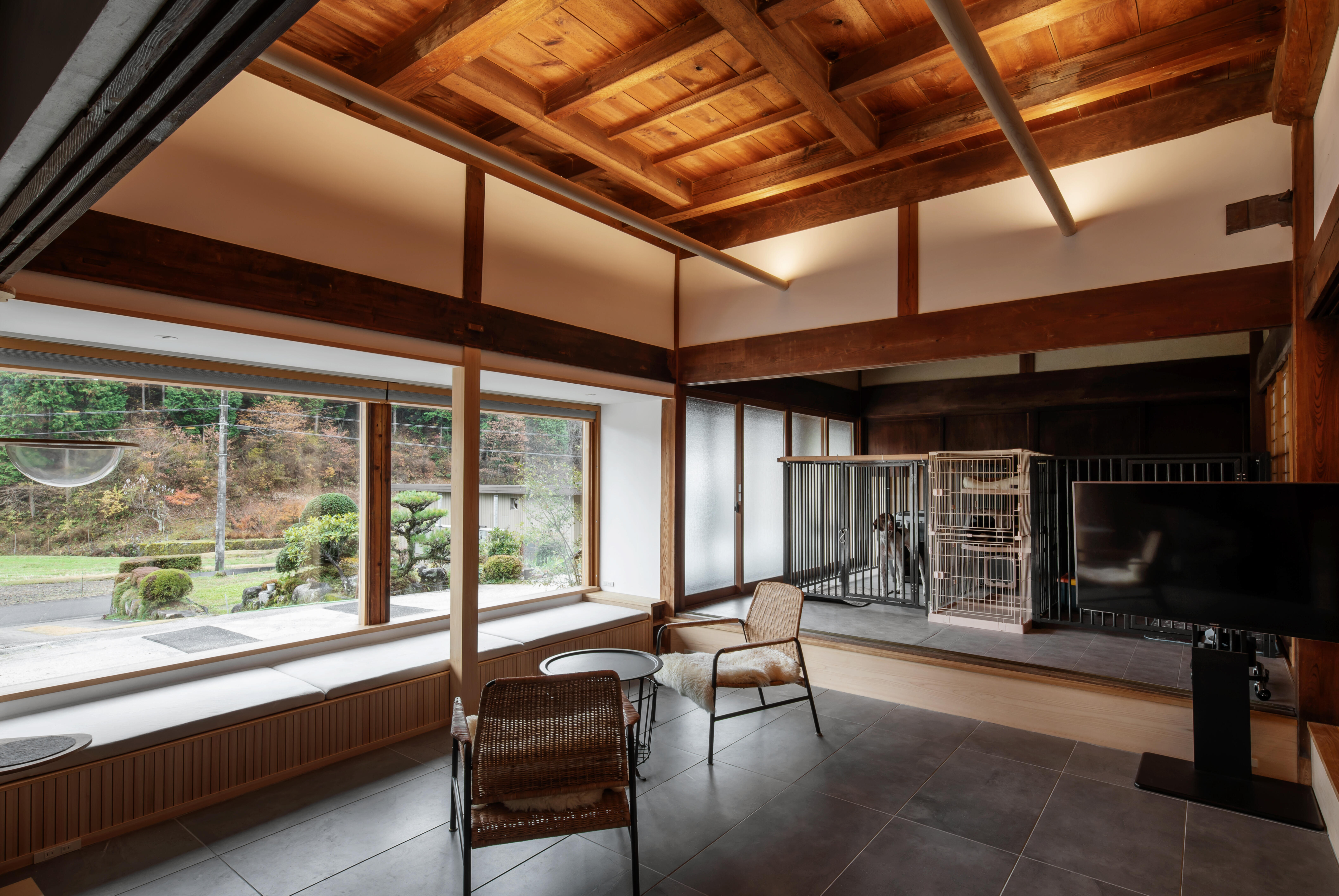 和室を改修した「動物たちの間」は、人と動物が安心して過ごせる空間です。スムーズな動線と、耐久性・清掃性に優れた素材を採用し、自由にのびのびと行き来できる設計で、動物たちとの暮らしがより楽しく、快適になりました。
