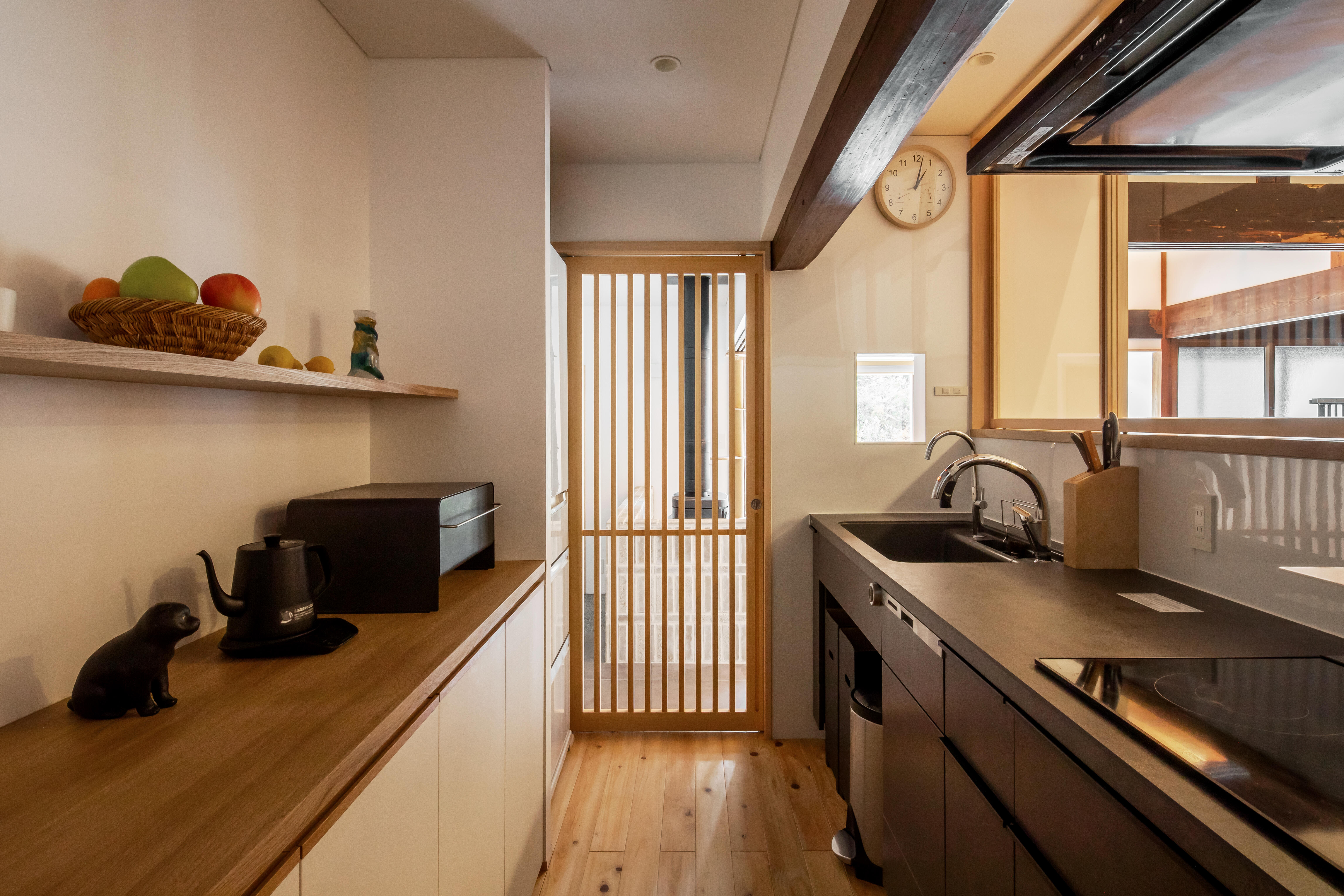 キッチンは、使いやすい動線を意識し、壁、建具、ガラス窓で囲った設計とすることで動物たちの侵入を防止し、視線が抜ける開放感と回遊性を実現しました。さらに、構造上の制約で囲炉裏の間と床の高さに差が生まれましたが、その段差を逆に活かし、キッチンを一段下げて配置。