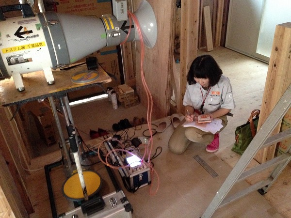 SW工法の住宅は、1棟ごとに気密測定を実施し、建物の気密性能を確認します。