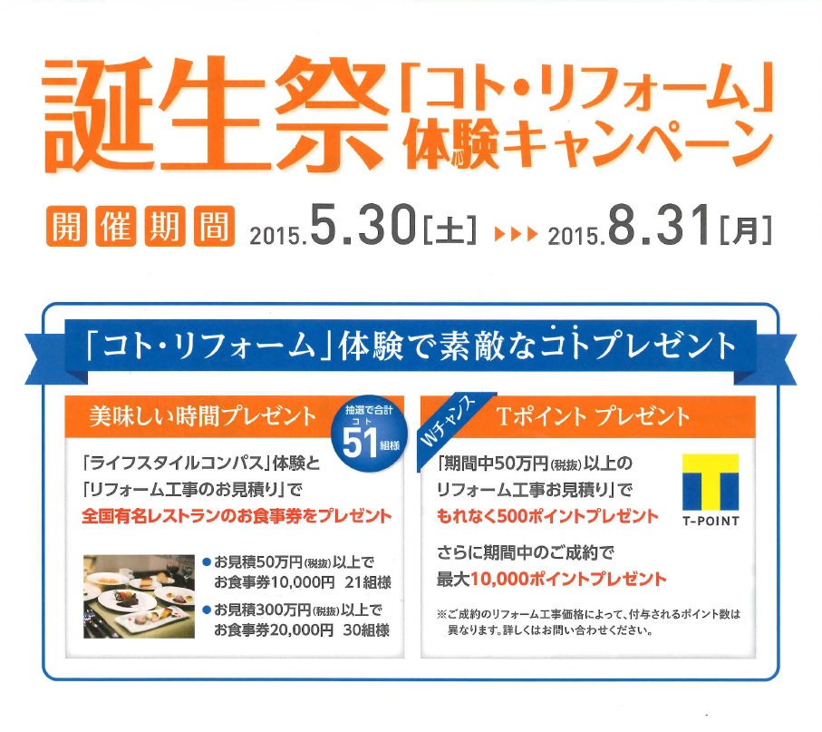 5月30日から8月31日まで、コト・リフォームのキャンペーンを行っています。