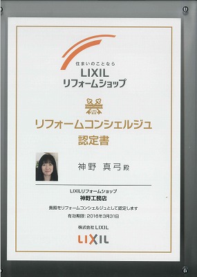 LIXILリフォームショップより、コンシェルジュ認定書を頂きました。
