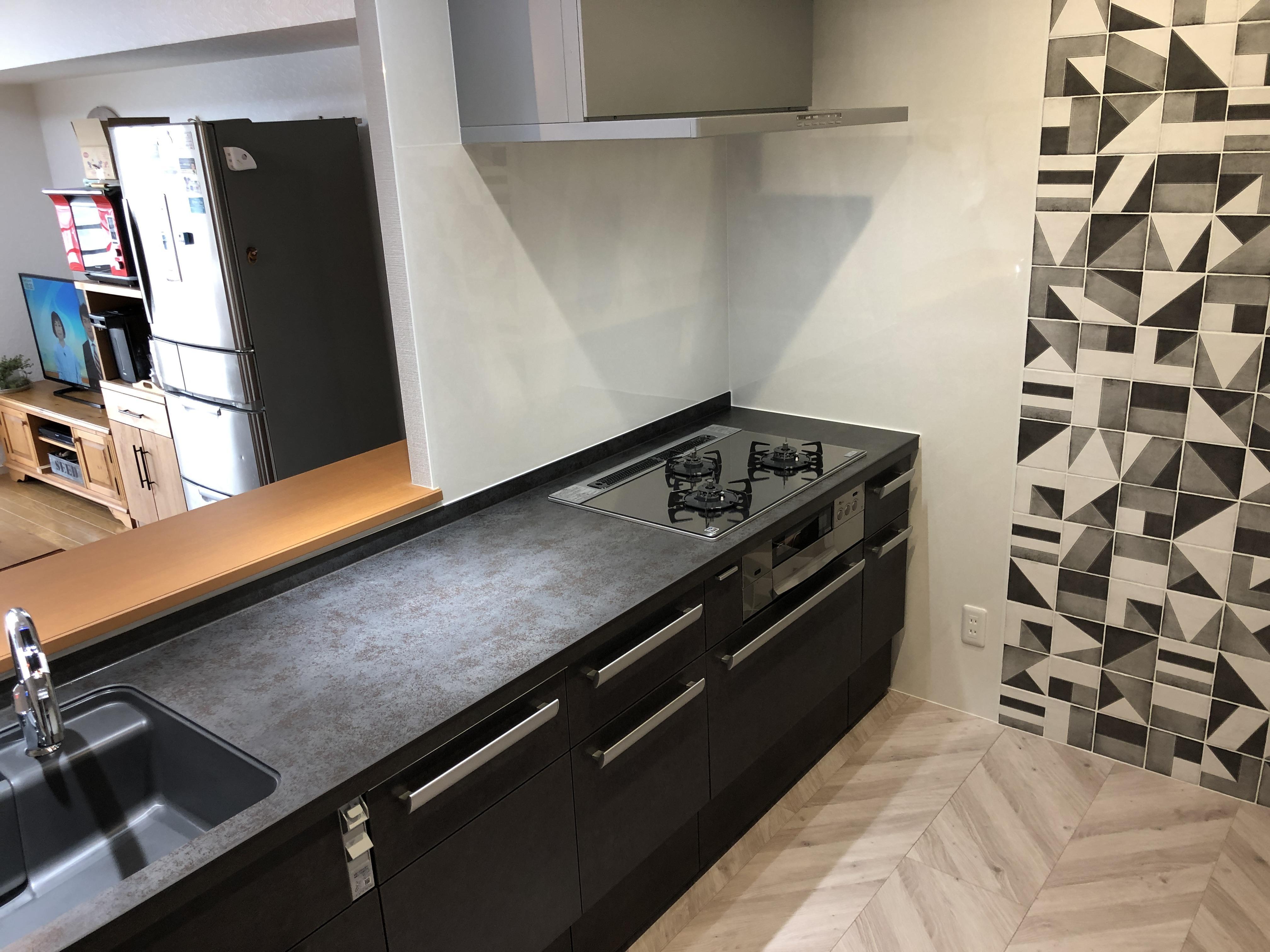 壁にはモダンなタイルを使用しています。 黒のキッチン珍しいですよね!