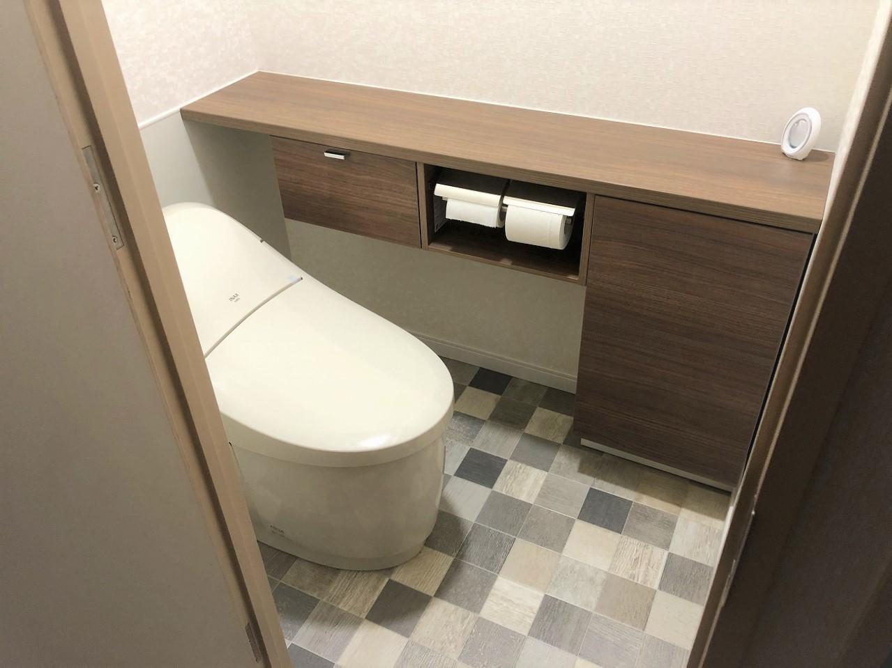 トイレの交換工事・クロス張替え・収納スペース取付をさせていただきました。