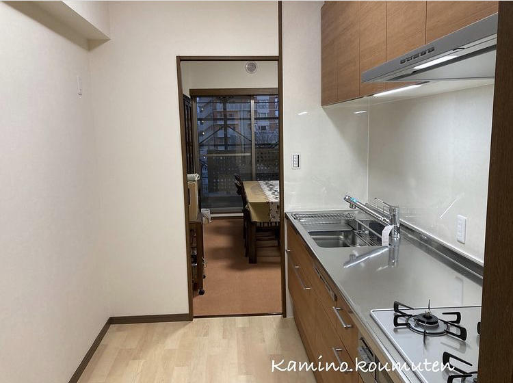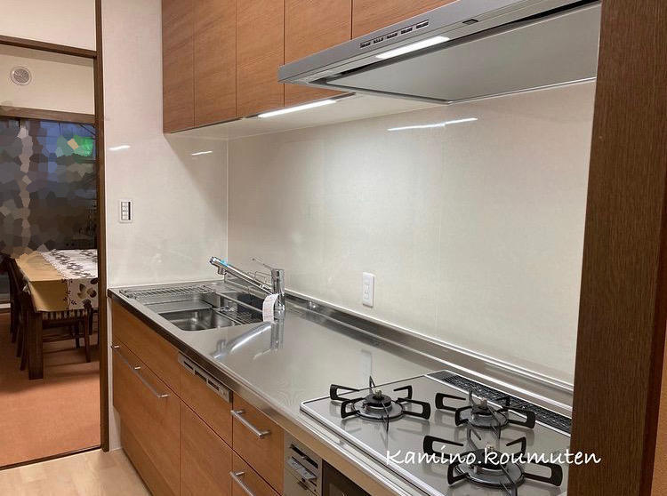 床もキッチンのデザインと合わせて木目調柄の明るい色味の床にしています。