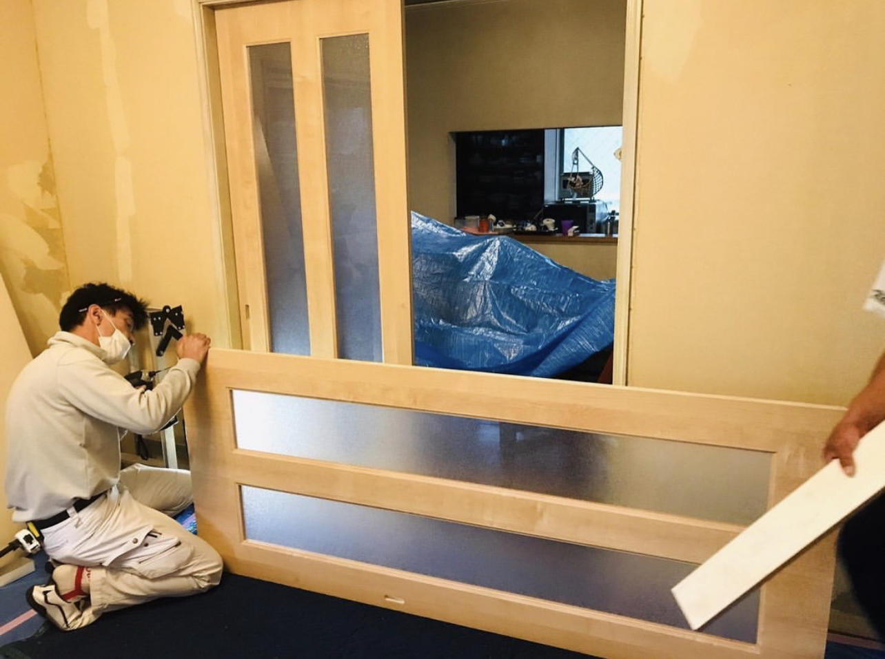リビングからキッチンに繋がる扉を、LIXILの引き違い戸に交換工事をしました。