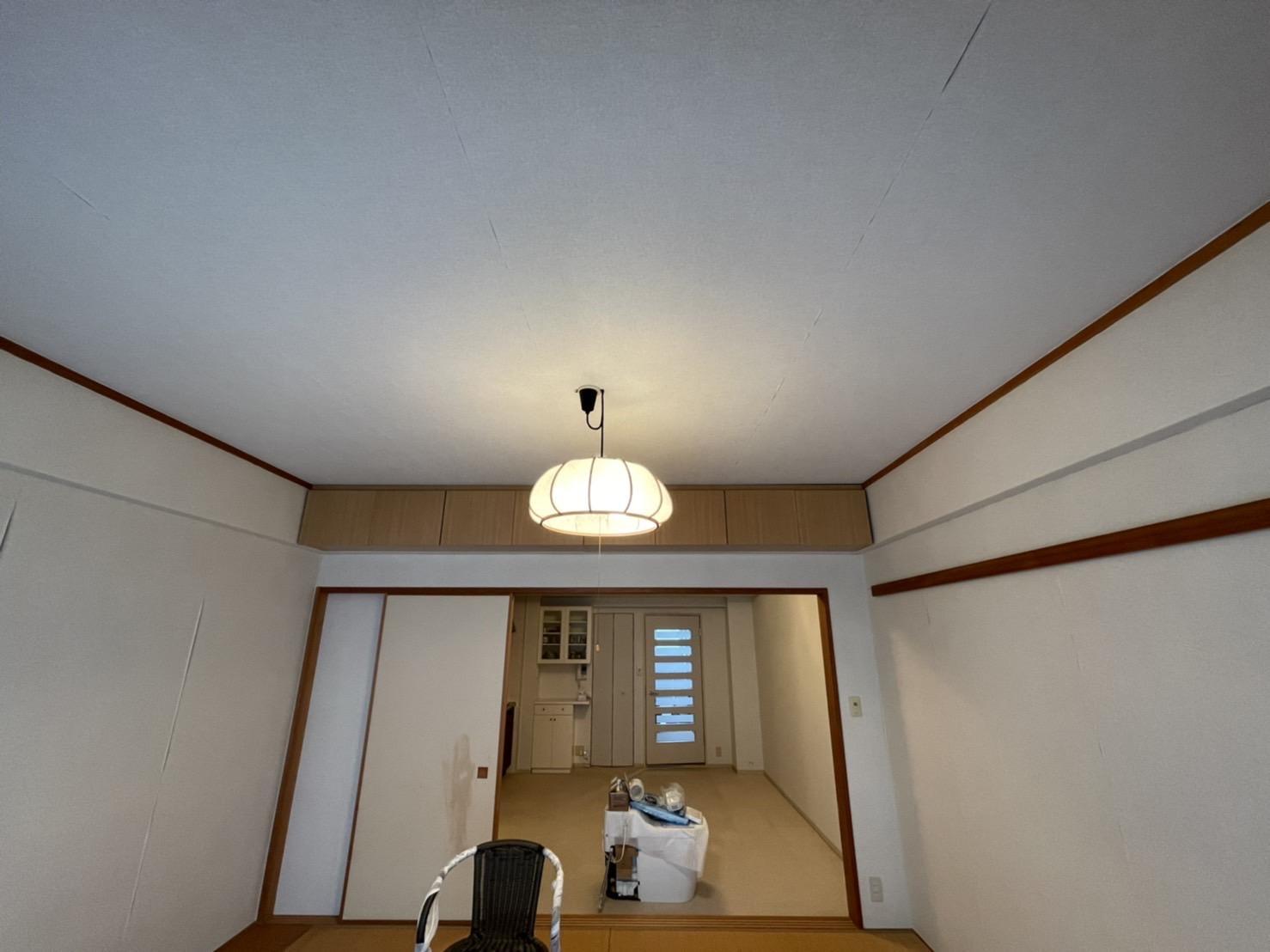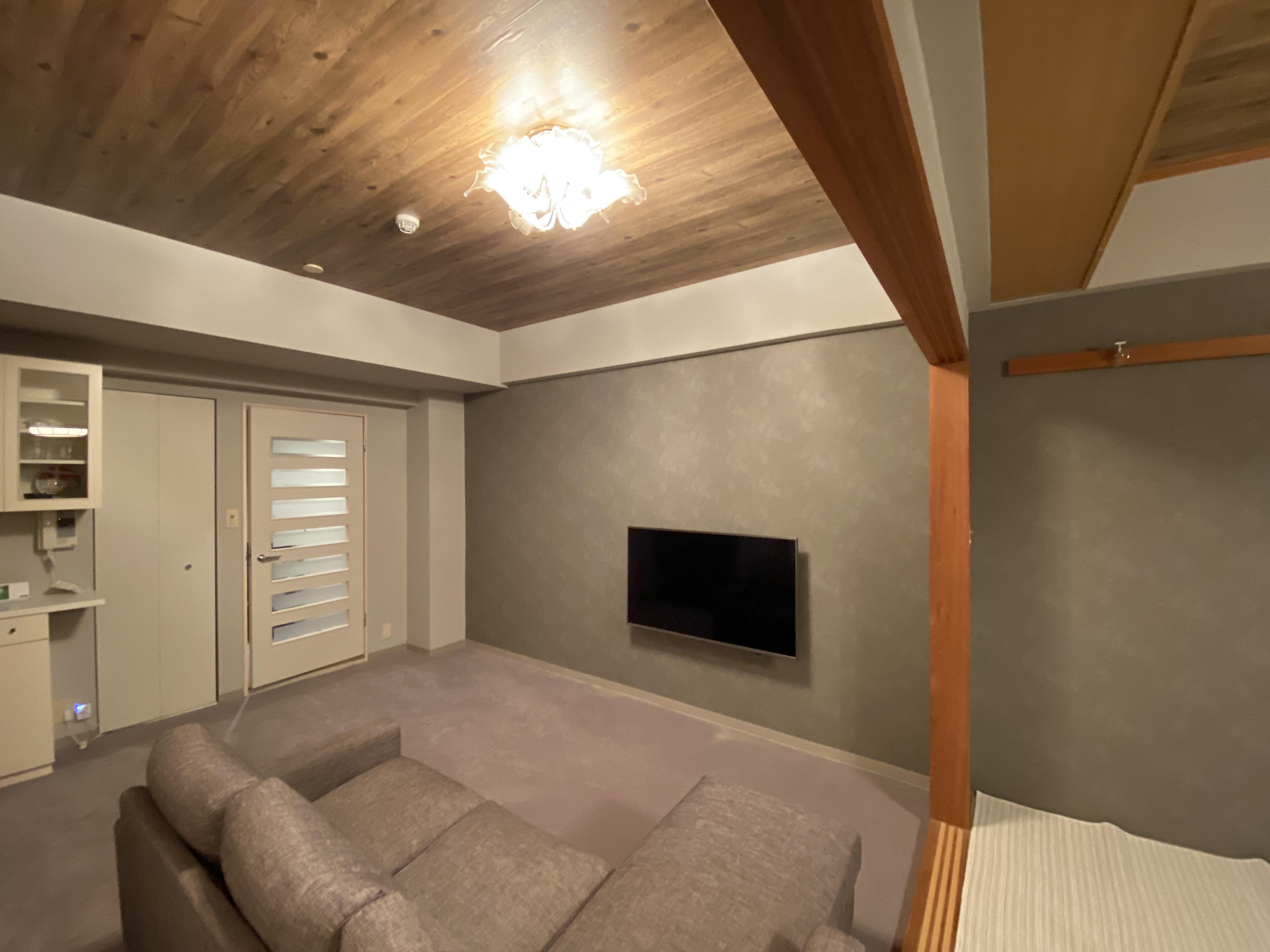 天井を木目調のアクセントクロスにする事によって、