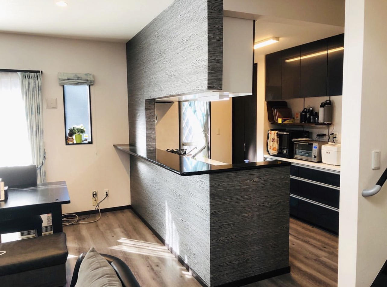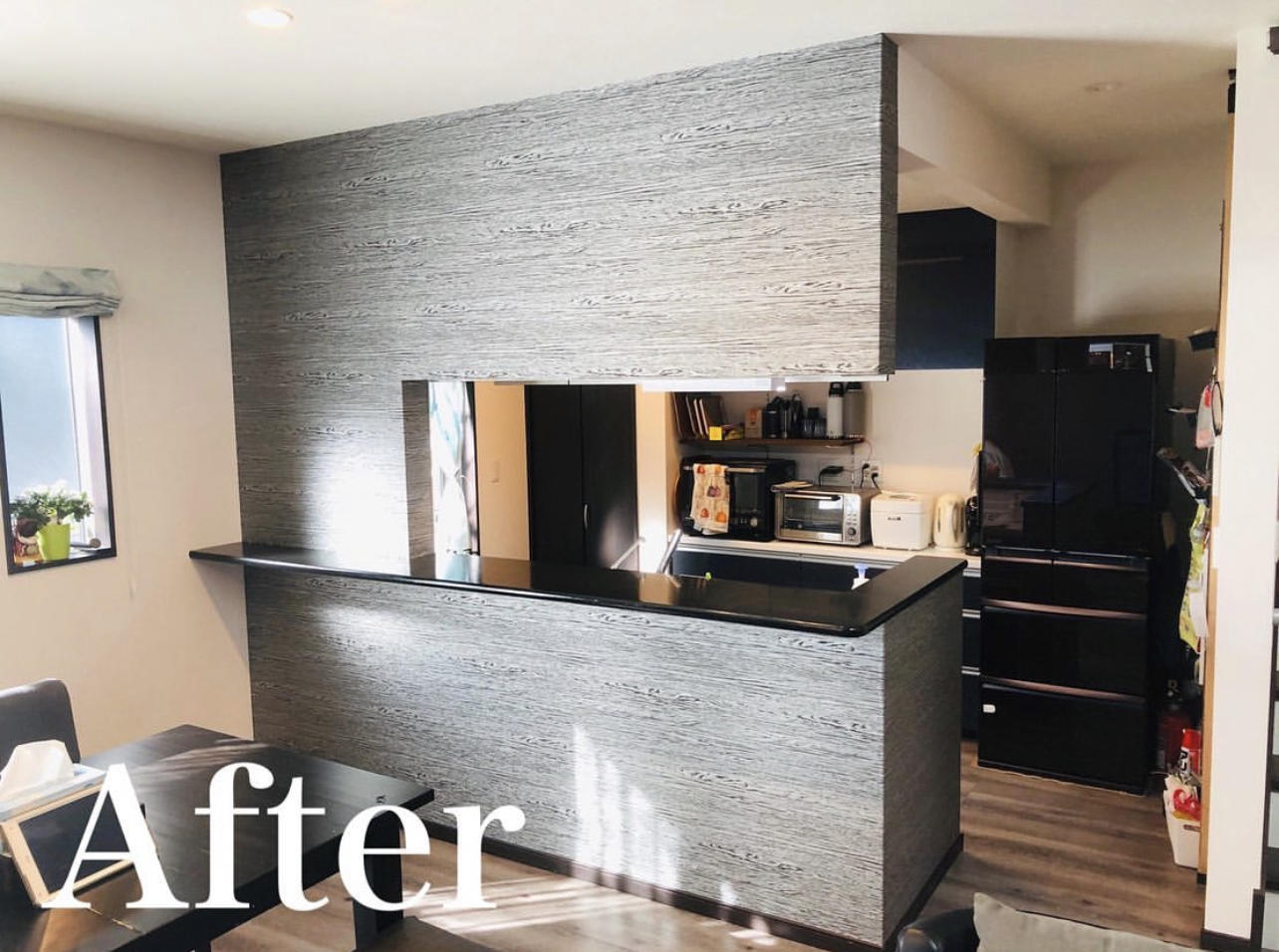 黒とグレーの木目調のアクセントクロスで かっこいいキッチンに仕上りました♪