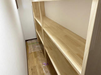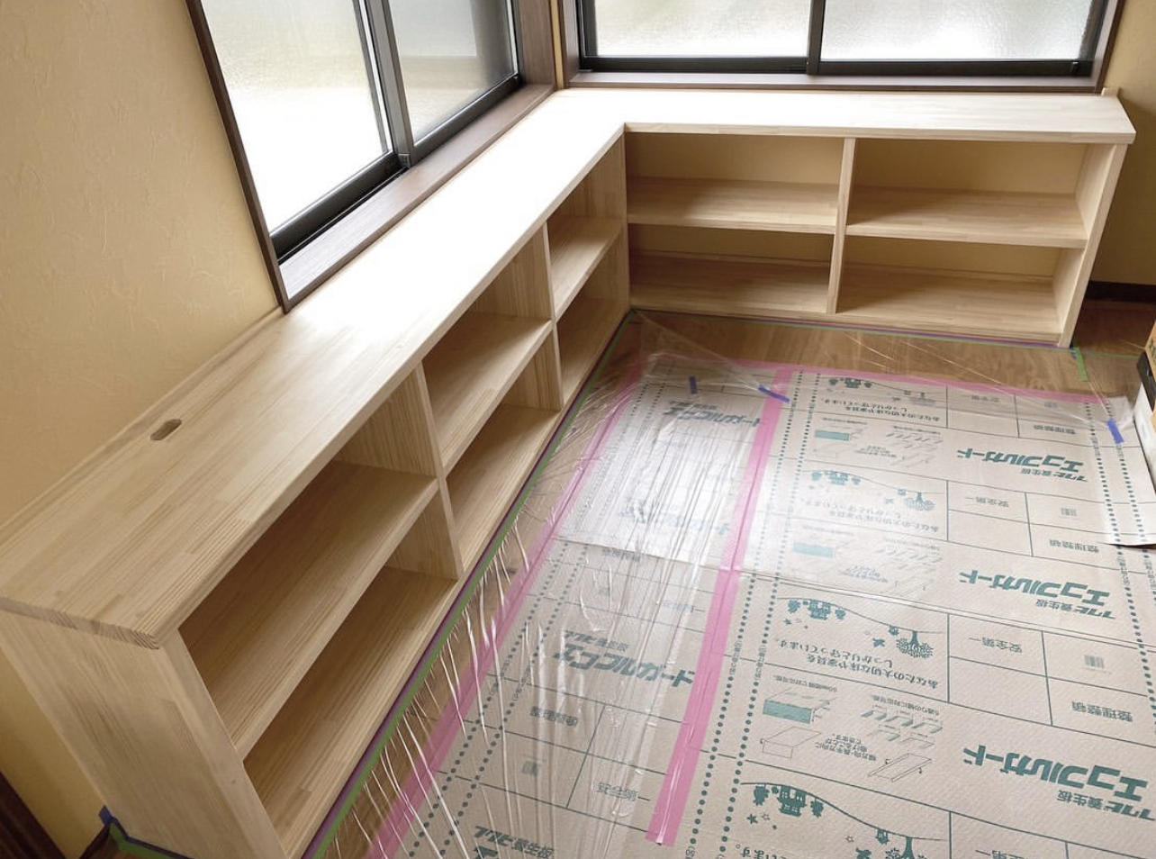 築150年古民家再生のO様邸にて お施主様のご要望で大工さん造作の本棚とテレビボードを作成いたしました。