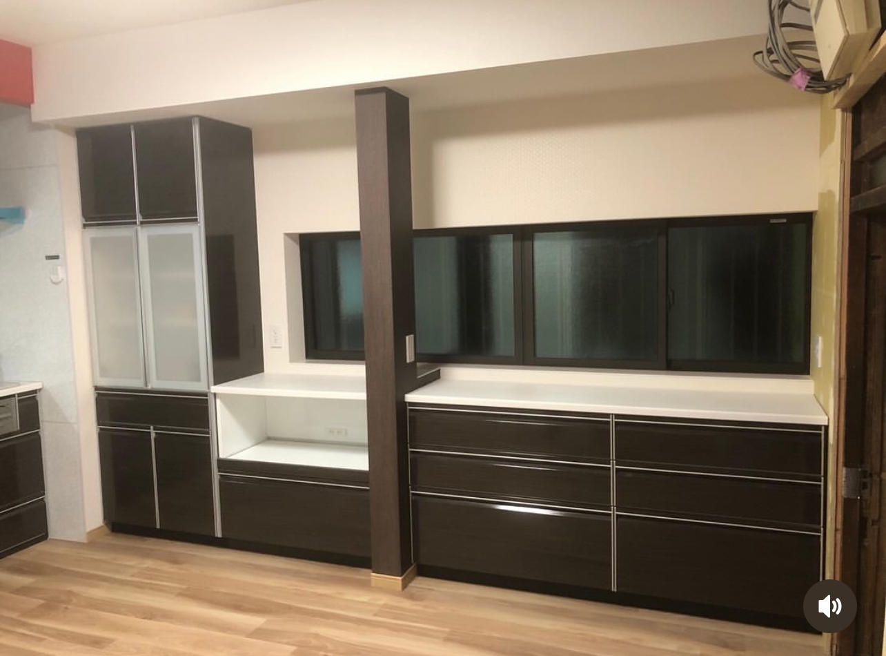 分断させていた柱を利用し左右に家電収納と引き出しタイプの収納を設置し収納たっぷりになりました。