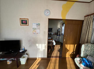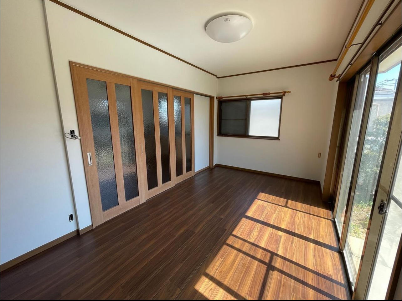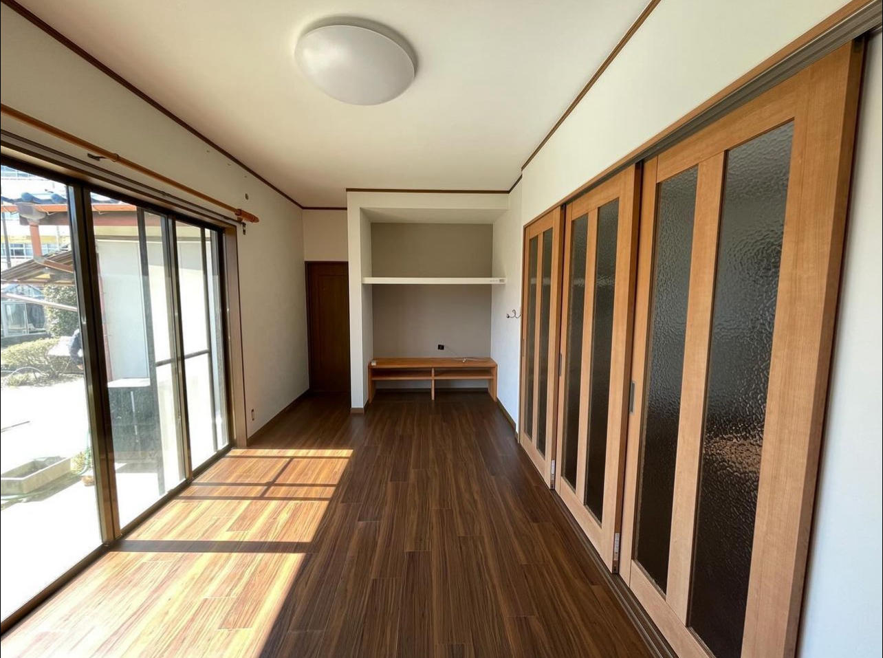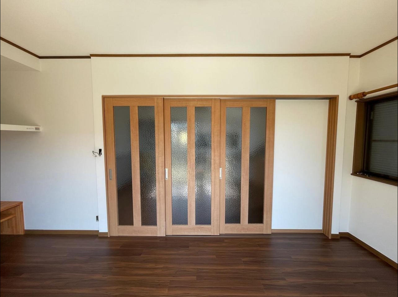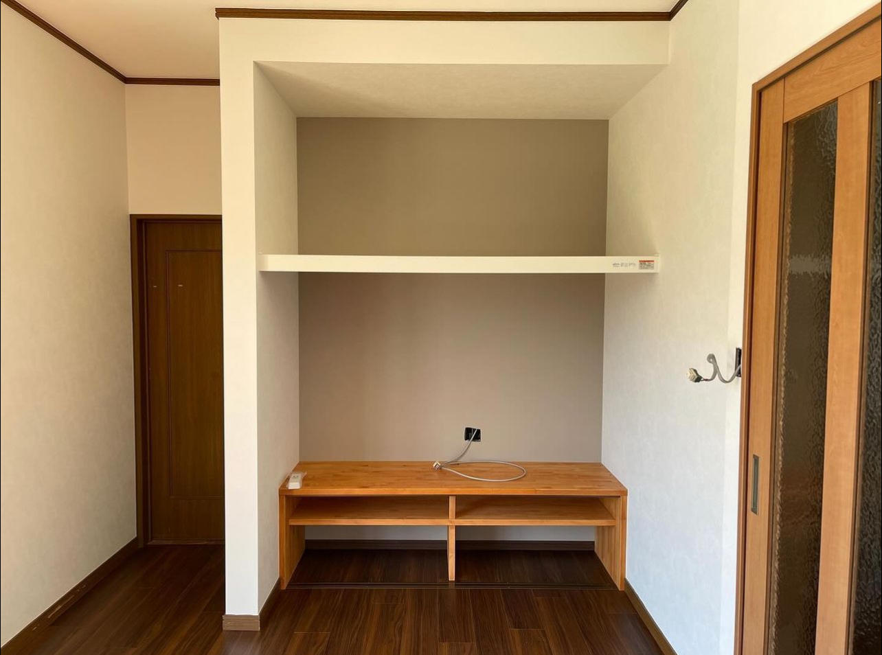 内装工事では、クローゼットのあった場所にテレビ台を造作し、既存のドアと壁を解体し、3枚引き込み戸の建具設置工事を行いました❕