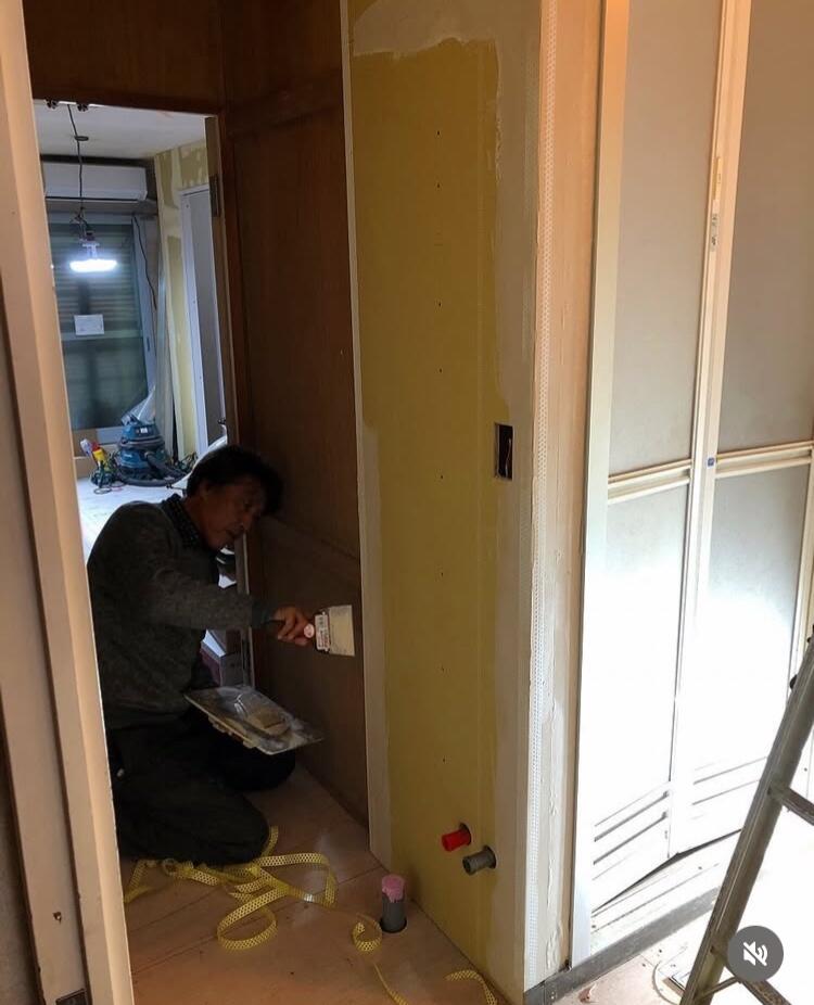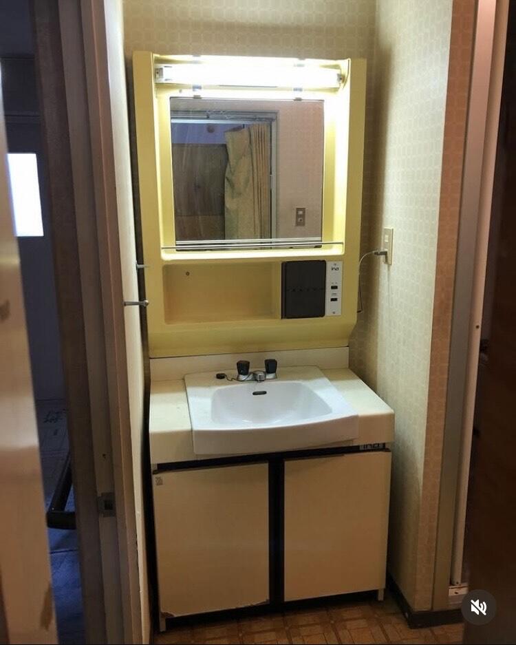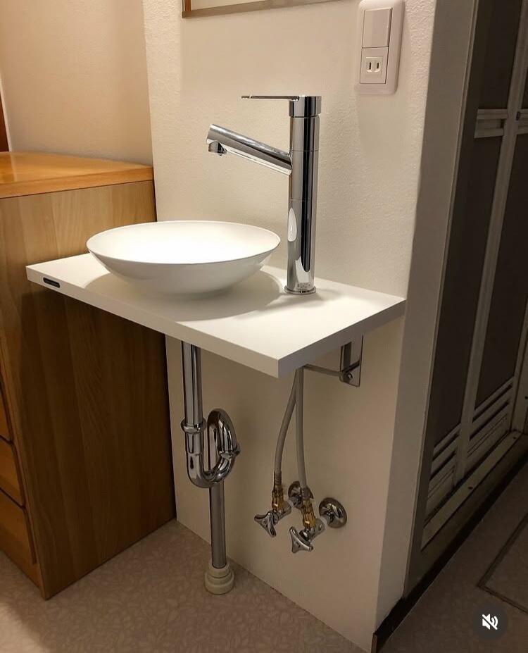 既設の洗面化粧台を撤去 後ろの壁を抜き人が通れるように 設置の向きを変えてみました。