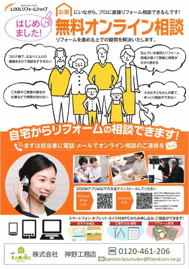 自宅又は神野工務店のお店からでもOK!おみせの担当者と一緒にリフォーム相談できます!
