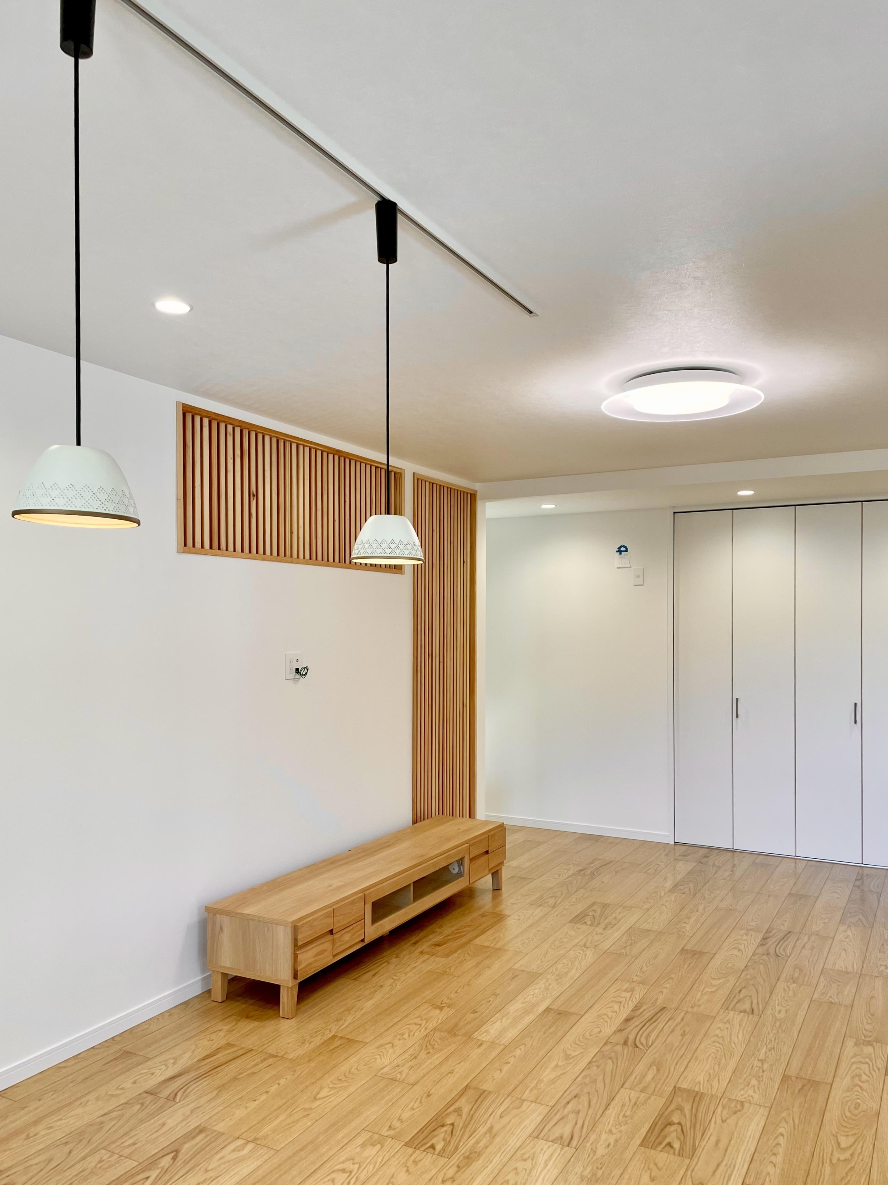 DKに隣接する和室や物入を取り込み、開放的な大空間に変更。