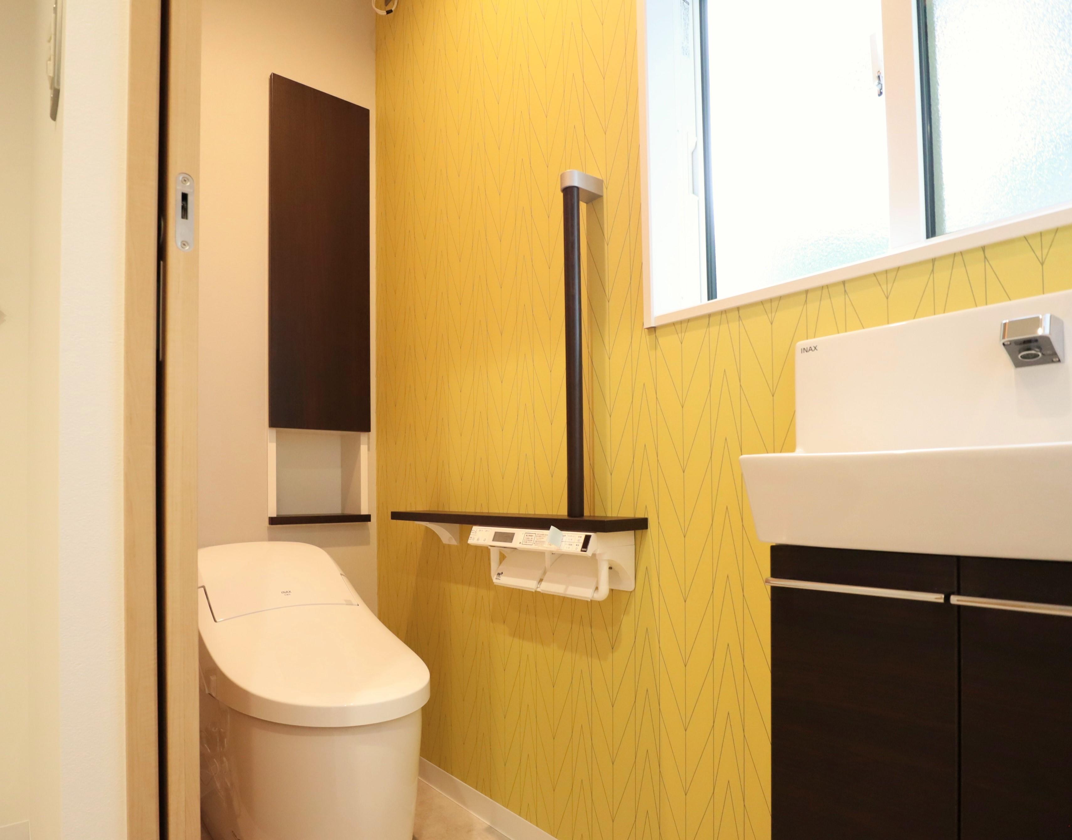 収納や手洗い、手すりを備えた、機能的なトイレにリフォームしました。 トイレはプレアスLS、手洗い器にはコフレルを採用。 背面には埋込収納棚を設置し、すっきりと収納。 イエローがアクセントの明るい印象のトイレになりました。