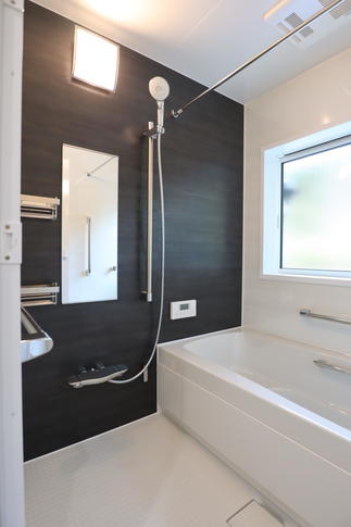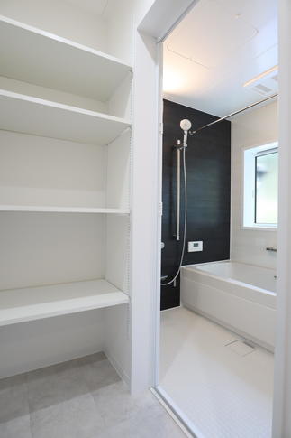 スパージュのゆったり1717サイズを採用し、 広々とゆったりくつろげる暖かい浴室にリフォームしました。 浴室入口の近くに設けた収納棚はタオルや衣類の収納に便利です。