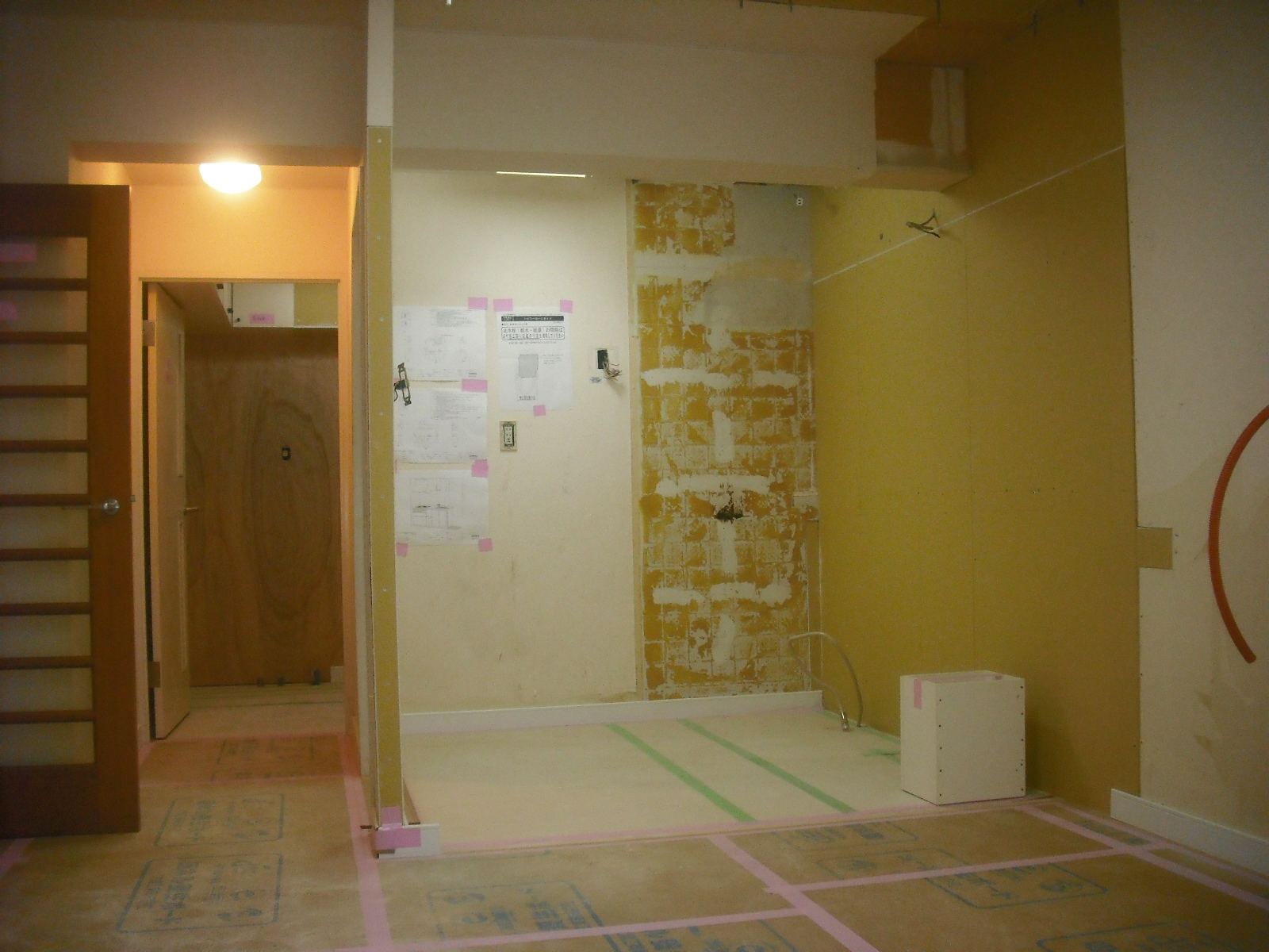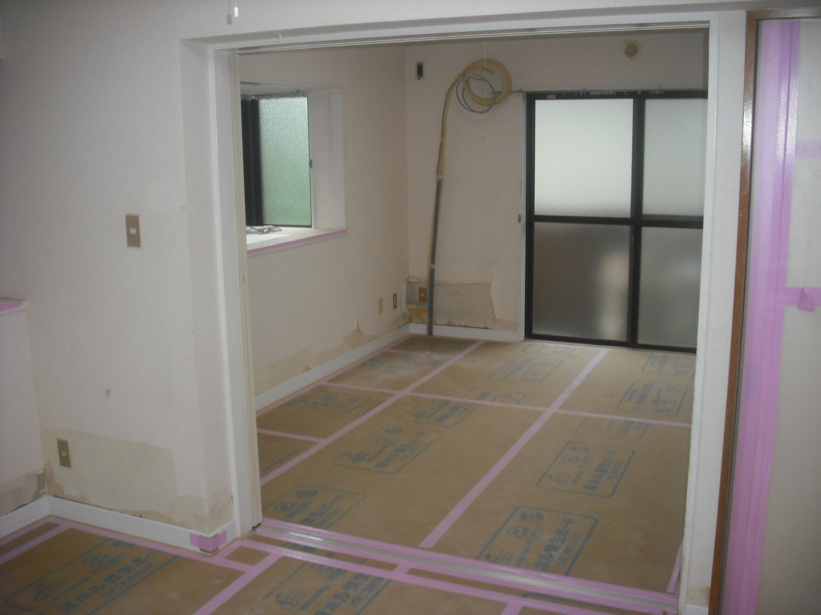 フローリング貼りも完了でキズがつかないように養生しておきます。