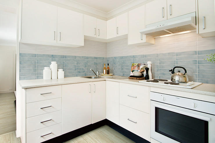キッチン収納と吊戸の間の空間にスペイン製の輸入タイルを貼りました。