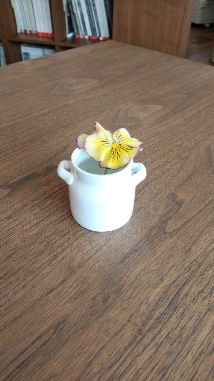 いただいたプリンのうつわを一輪挿しに、今日はパンジーの色違い。