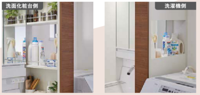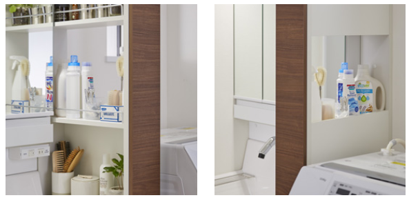 キャビネットの棚はオープン棚に!洗面化粧台側からも、洗濯機側からも