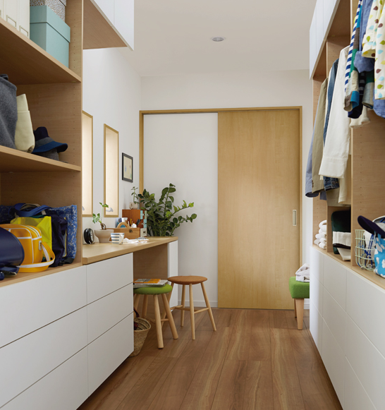 玄関、キッチン、バスルームすべてのハブとして、家族のストレージエリアを配置。