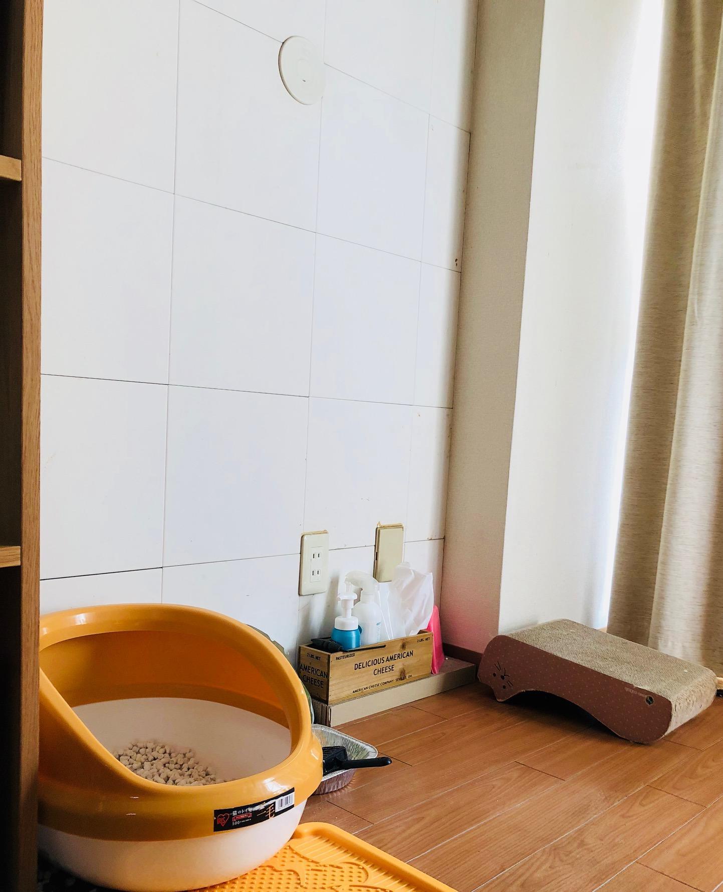 ↑エコカラットの壁側にのんちゃんのおトイレや爪とぎを設置しています。