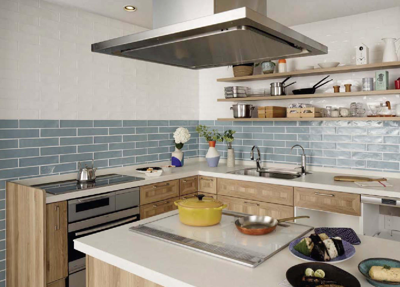 ↑シンプルなカラーのタイルを組み合わせて、カフェのようなキッチンも可能です。