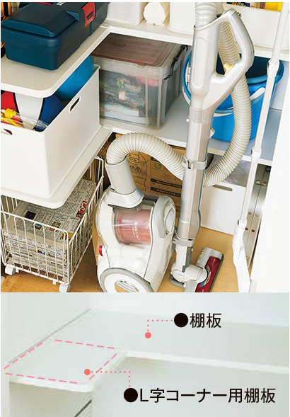 1.棚板をL字使いにすることで、奥のものも見やすく取り出しやすい!