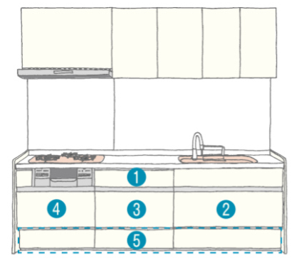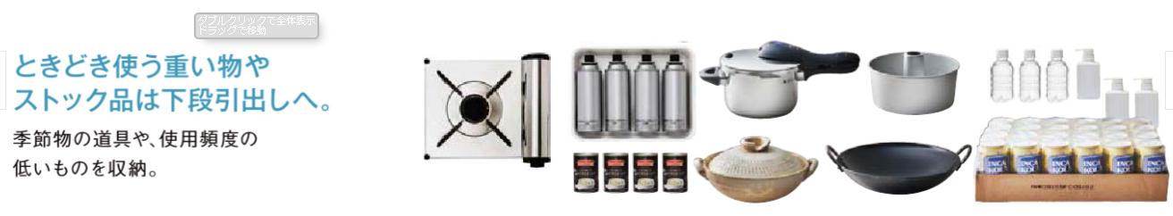 ③の引き出しには、調理スペースやコンロで使う調味料や食材を収納↓
