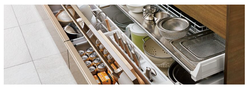 リクシルのキッチン収納は、よく使うものや、調理道具を使う場所の近くに