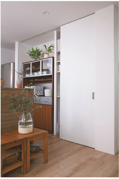 天井までの高さがあり、真っ白な引戸なので閉めればさっと隠せて、まるで壁のように見えます。