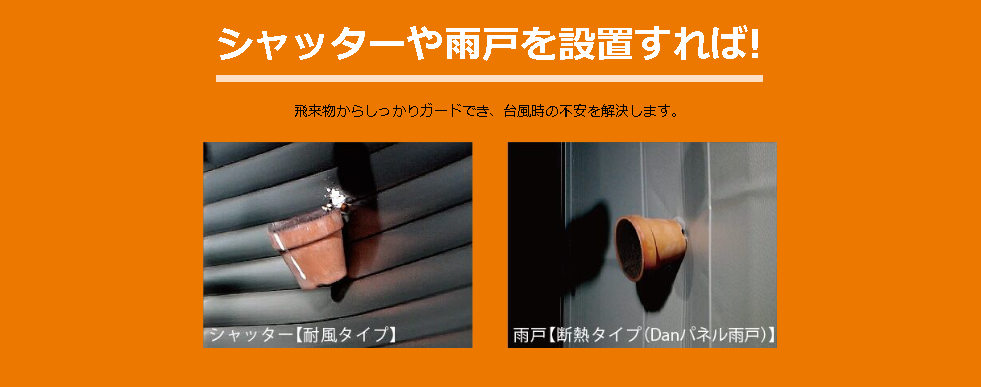 シャッターや雨戸を設置すれば飛来物からしっかりガードでき、台風時の不安を解消します。
