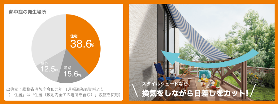 実は、熱中症の約4割は室内で発生しています。特に今年は外出自粛により在宅時間が増えることで、室内熱中症のリスクが高まることが危惧されています。室内の温度上昇を抑えるための日よけ対策も重要なポイントです。外付日よけ「スタイルシェード」なら、窓を開けて換気をしながら、暑い日差しをカットすることが可能です。在宅環境を快適にしながら室内熱中症予防にもつながります。