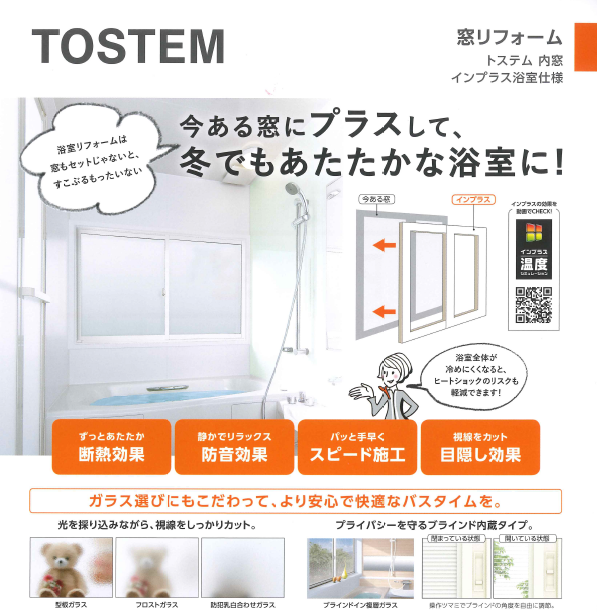 今ある窓にプラスして、ずっとあたたか断熱効果、静かでリラックス防音効果などすこぶる快適な浴室のおすすめセットリフォームのご案内です。