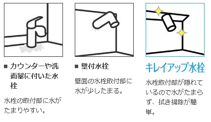 水栓が上から出ていて、水栓まわりに水がたまらずお手入れ簡単。