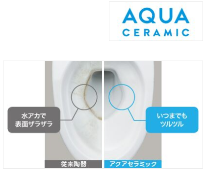 水となじみやすいアクアセラミックは、便器洗浄やお掃除をするたびに汚物を浮かせて洗い流すので、お掃除簡単!