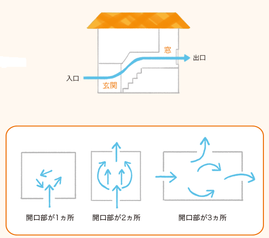 風には「入口」と「出口」が必要!窓が1つだけだと風が通りませんので、玄関を入口にして室内の窓を出口にするなど、風の通り道を作ってあげると風が通るようになりますね!