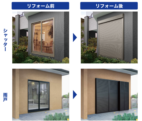 今ある窓に後付けできる「リフォームシャッター」や古い雨戸や雨戸がない窓にも後付けできるリフォーム雨戸がおすすめです。