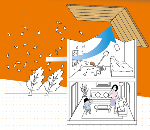 ガラスの破片が飛び散ったり、2階の窓が割れると突風が室内に入り込み屋根が吹き上がってしまう危険性も!