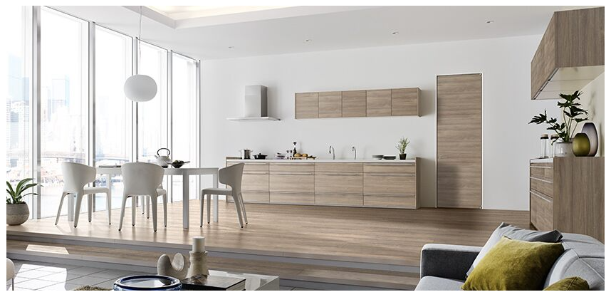 彩度を抑えた落ち着きのあるグレイッシュな木目カラーで、キッチンと室内ドアをコーディネート。モダンな横目使いの木目が、空間を広く見せてくれます。