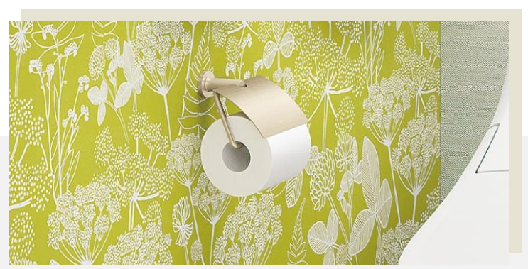 植物や鳥など自然をモチーフにしたテキスタイル風の壁紙は存在感もあり、元気が出ます。ニッケルのタオルリングと紙巻き器は個性的な壁紙とも相性抜群。陶器の白と木目のインテリアがよく似合いますね。北欧のぬくもりで元気になるトイレリフォームのご相談はお気軽に、SHOEI西荻店までご相談ください。