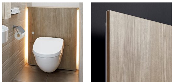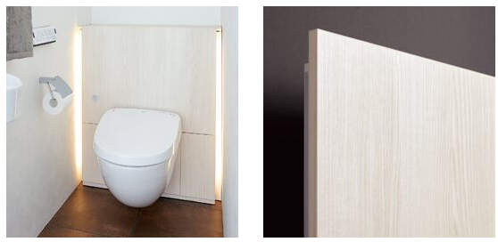 フロートトイレのアイデンティティともいうべき、背面のパネルカラーはさまざまなインテリアとの相性が考慮されたホワイトアッシュとグレーアッシュの2色展開。