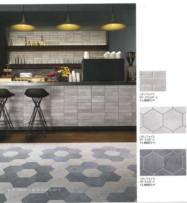 例えば、シックなキッチン空間を演出するエイジング感のあるリネン柄が特徴のタイルはいかがでしょうか。他にも素敵なタイルコーディネイトのご提案いたします。お気軽に、SHOEI西荻店までご相談ください。