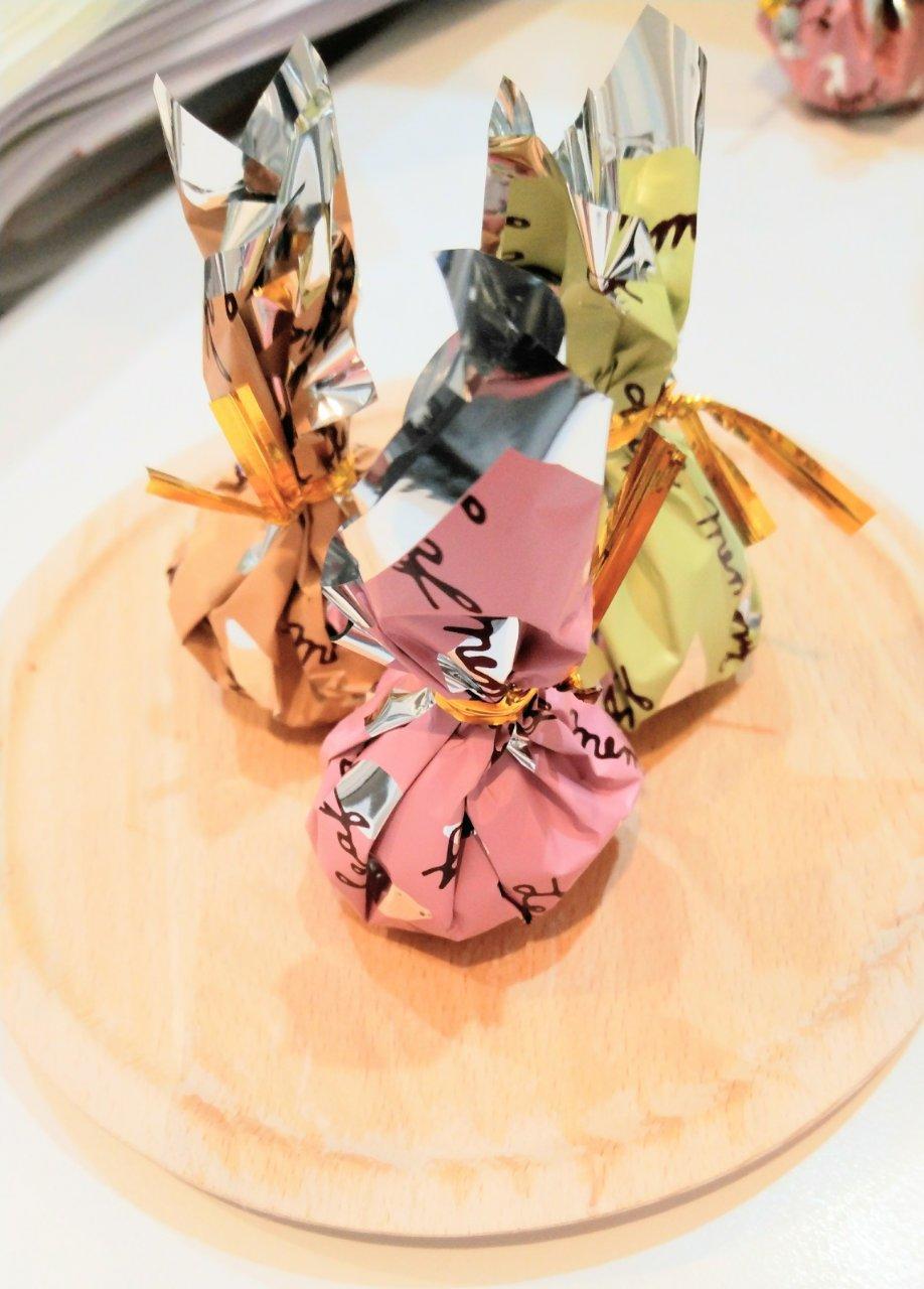 グリーンの巾着は抹茶風味、オレンジ巾着はモカ風味、ピンクの巾着はクランベリー!午後のティータイムにおくちどけとろける美味しさで、みんなでいただきました。いつもありがとうございます♪
